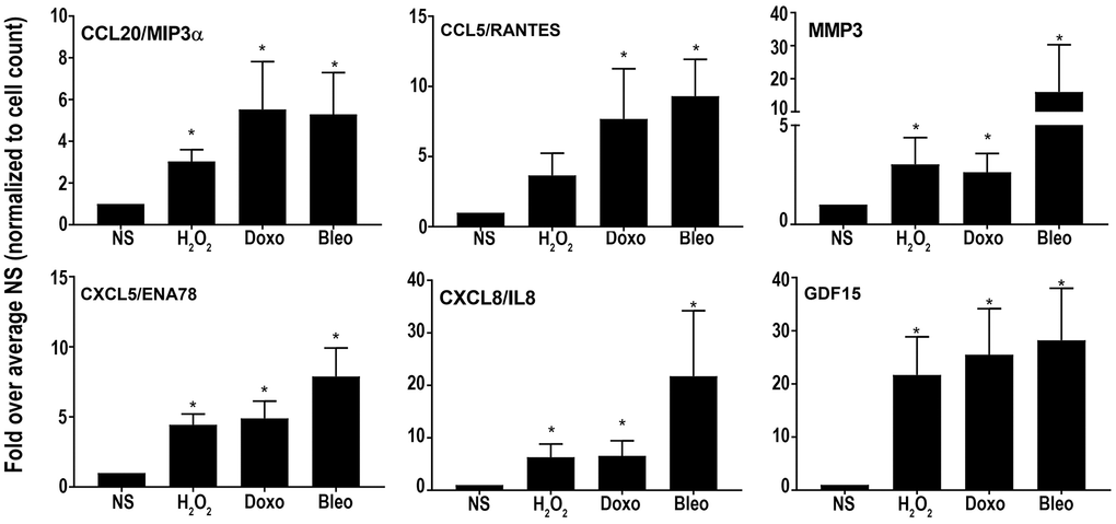 Overall, the core senescent profile was composed of several upregulated cytokines and chemokines (CXCL1/GROα, CXCL2/GROβ, CXCL5/ENA78, CXCL8/IL8, CXCL14, and CCL2/MCP-1, CCL5/RANTES, CCL20/MIP3α), growth factors (GDF15, BMP2), proteases (MMP3, MMP12, PLAT, SERPINI1), protease inhibitors (CST1, CST2, CST4, C3, IGFBP2), tumor necrosis factor receptors (TNFSF13B, TNFRSF10C), transmembrane proteins including transporters and channels, histones, signaling molecules (NOTCH3, NR4A2, FOSC, RELB, STAT), and glycoproteins such as STC1. We specifically assessed colon fibroblast senescence genes that could contribute to a SASP, modulate the tissue microenvironment, alter the function of the colon and potentially alter the risk for disease. We thus focused our validation studies on those transcripts that are translated to secreted proteins and focused on the core senescent profile shared by all the inducing agents, which interestingly, is enriched for secreted proteins (p < 0.0001). We selected eight candidates (CST4, CCL20, CX3CL1, CXCL5, CXCL8, GDF15, CCL5 and MMP3) that play an important role in cancer pathogenesis for further study [3, 4, 8–12, 15, 39]. Another relevant SASP gene, GDF15 has already been characterized for its pro-tumorigenic effects in CRC by our group [12]. We first performed RT-qPCR using transcript-specific pre-designed primer pairs to confirm the RNA-Seq results (Figure 2C). Expression levels of all transcripts were up-regulated in all senescent cells, except for CX3CL1 and CCL20, which were below the detectable range in all samples. Conditioned media was then collected at the end of senescence induction to assess protein secretion (Figure 3). After normalization to the number of cells contributing to the conditioned media, we confirmed the elevated secretion of CXCL8, CCL20, CXCL5, GDF15, MMP3 and CCL5 in senescent cells, while CX3CL1 (fractalkine) was undetectable. Together, these findings confirm that elevated expression of CXCL8, CCL20, CXCL5, GDF15, MMP3 and CCL5 at the transcript and protein levels are part of a universal senescent colon fibroblast SASP.