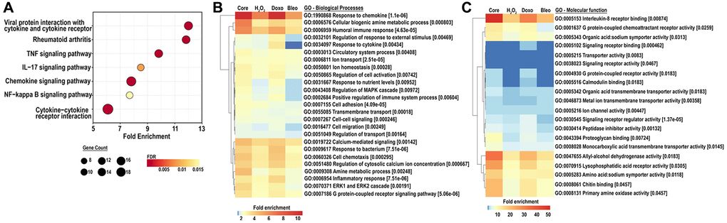 To further investigate a shift in cellular function corresponding to the senescent associated transcriptome, we scrutinized pathways upregulated by either doxorubicin, bleomycin or H2O2-induced senescence as well as in the core senescent profile. We performed KEGG analysis for pathways enriched in stimulus-specific senescent transcriptomes as well as in the core senescent profile. The most robustly enriched pathways (Figure 4A) included the cytokine-cytokine receptor pathway and chemokine signaling pathways (list of genes in Supplementary Table 3). An enrichment of TNF pathway and NF-κB signaling pathway was found, consistent with prior studies [40]. Analyses were also performed for gene ontology based on biological processes (GOBP) and molecular functions (GOMF) of the core senescence-associated profiles, which characterized the dominant biological processes and molecular functions of cells expressing this profile. We identified 25 top pathways (Figure 4B), which were selected after accounting for redundancies by collating all relevant pathways with over 90% gene overlap (full dataset in Supplementary Table 4A, 4B). Similar to KEGG analysis, GOBP identified several cytokine-related biological processes with autocrine/paracrine significance including chemokine-mediated signaling pathway, cellular response to chemokine, and immune modulation including chemotaxis and migration of various immune cells (granulocytes, neutrophils, leukocytes and myeloid derived leukocytes). The core senescent profile also displayed the activation of several signal transduction cascades including STAT pathways (via tyrosine phosphorylation), MAPK and ERK pathways, calcium-mediated signaling pathway and G protein signaling pathways. The enrichment of transporter and channel activity, and calcium-ion regulatory mechanisms was also observed, indicating ionic flux in senescent cells. Analyses of molecular function (Figure 4C, Supplementary Table 5) similarly indicated the enrichment of chemokine-related activity, particularly that of CXCL8/IL8, inflammatory mechanisms, elevated activity of various transmembrane channels, activation of receptors to chemokines/cytokines and enzyme lytic activity, indicating an ability to modulate the surrounding milieu. Thus, KEGG, GOBP and GOMF together confirm a persistent elevation in cytokines and chemokines that may have paracrine and systemic effects on the tissue microenvironment. Interestingly, our analyses did not identify any notable differences in pathways or GO’s related to cancer or aging between the various treatments for senescence induction.