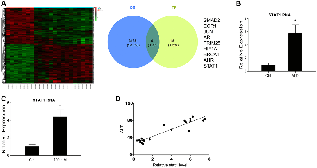 Next, we tried to identify the upstream factors of miR-99b in ALD. The microarray analysis identified the abnormally expressed mRNAs in ALD mice and the overlap analysis was performed based on the differently expressed mRNAs and the transcriptional factors of miR-99b, in which STAT1 was identified (Figure 2A). We next validated these findings using in vitro and in vivo models. The elevated expression of STAT1 was validated in ALD mice (Figure 2B). Meanwhile, the treatment of EtOH induced the expression of STAT1 in the AML-12 cells (Figure 2C). The expression of STAT1 was positively correlated with ALT levels in the ALD mice (Figure 2D). These data indicated that miR-99b and STAT1 potentially participate in the ALD generation.