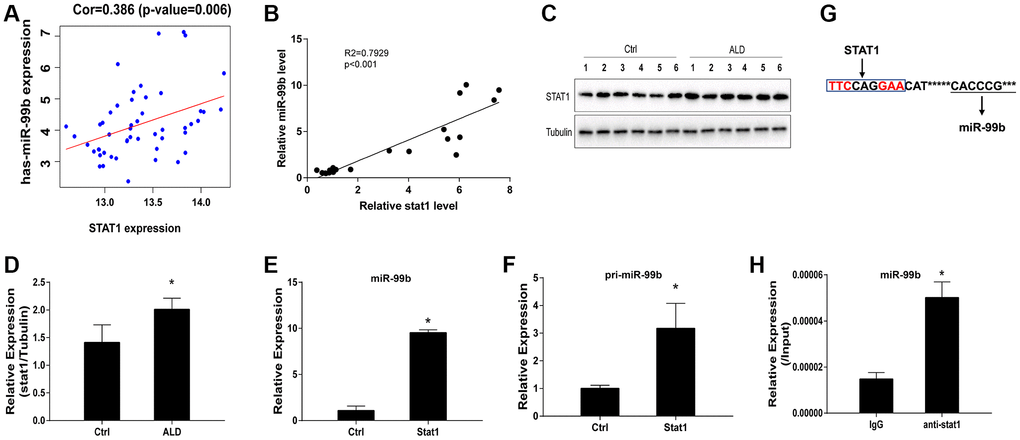 Furthermore, it has been found that NIK targeting PPARα by MAP2K1 disrupts hepatic fatty acid oxidation and exhibits high value in ALD therapy [25]. Rilpivirine represses liver fibrosis by selective STAT1-regulated apoptosis in hepatic stellate cells [20]. In this work, we demonstrated that the microarray analysis identified the abnormally expressed mRNAs in ALD mice, and the overlap analysis was performed with the differently expressed mRNAs and the transcriptional factors of miR-99b, in which STAT1 was identified. The elevated expression of STAT1 was validated in ALD mice from our model. Meanwhile, the treatment of EtOH induced the expression of STAT1 in the AML-12 cells. The expression of STAT1 was positively correlated with ALT levels in the ALD mice. The positive correlation of STAT1 and miR-99b expression was identified in bioinformatics analysis and validation in ALD mice by qPCR assay. We observed that the expression of miR-99b and pri-miR-99b was promoted by the overexpression of STAT1 in AML-12 cells. Further ChIP analysis confirmed the enrichment of STAT1 on miR-99b promoter in AML-12 cells.