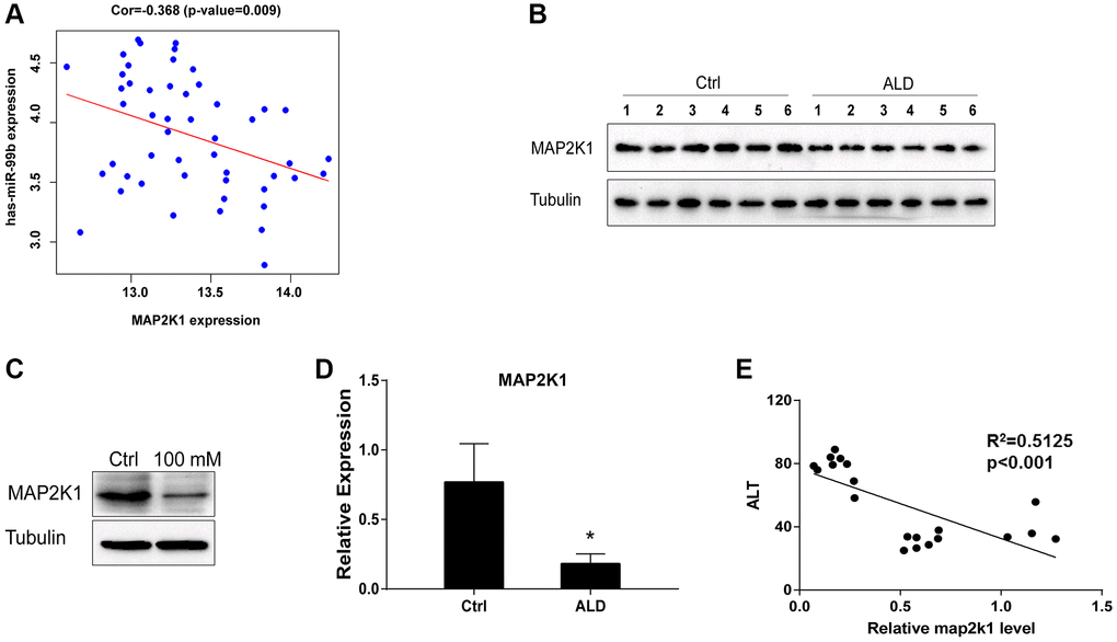 In this work, we adopted informatic analysis and experimental approaches to identify miRNAs and related regulatory signaling that associated with ALD. We identified a notable elevation of miR-99b in mouse ALD model, which is correlated with elevated level of alanine aminotransferase (ALT). Further analysis on upstream and downstream factors correlated with miR-99b indicated a STAT1/miR-99b/mitogen-activated protein kinase kinase 1 (MAP2K1) regulatory signaling. Our work may provide a novel therapeutic approach for ALD therapy.