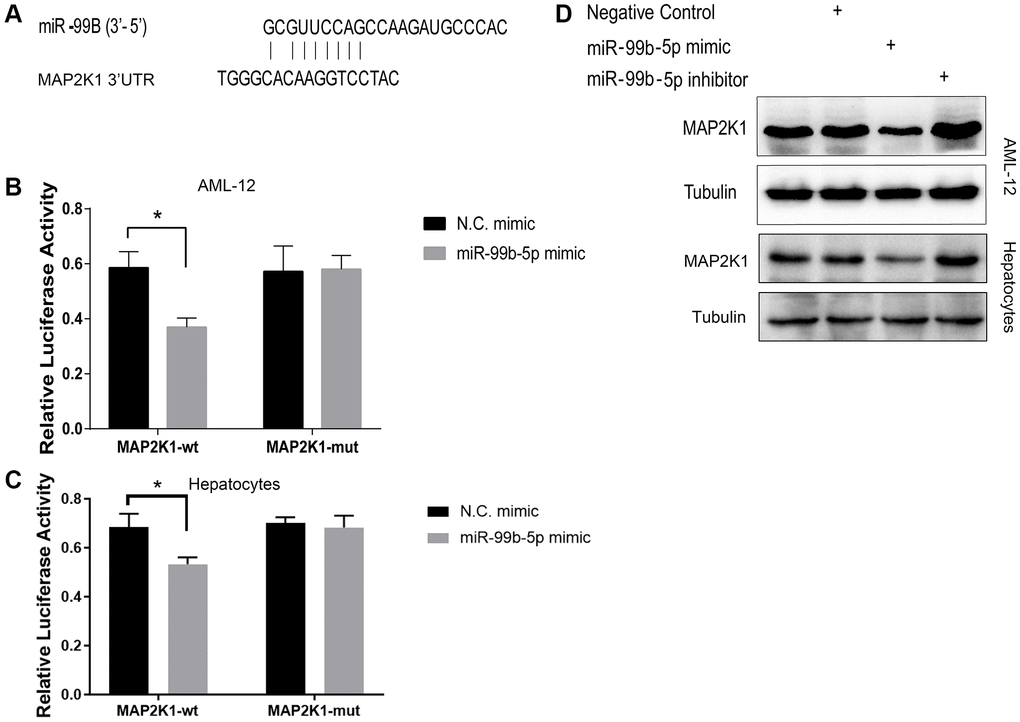 Then, we identified the binding site of MAP2K1 and miR-99b (Figure 5A). Meanwhile, the treatment of miR-99b mimic repressed the luciferase activity of MAP2K1 in AML-12 cells (Figure 5B) and primary hepatocytes (Figure 5C). The expression of MAP2K1 was suppressed by miR-99b in AML-12 cells and primary hepatocytes (Figure 5D).