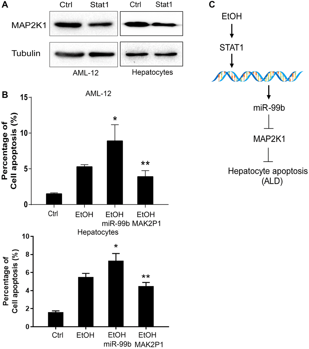 Next, we investigated the STAT1/miR-99b/MAP2K1 axis in hepatocytes. We observed that the expression of MAP2K1 was inhibited by the overexpression of STAT1 in AML-12 cells (Figure 6A). The apoptosis of AML-12 cells was induced by the treatment of EtOH, and miR-99b mimic promoted these effects. Meanwhile, the MAP2K1 overexpression vectors effectively elevated the expression of MAP2K1 expression (Supplementary Figure 1B) and abolished the promoting effects of miR-99b mimics on cell apoptosis (Figure 6B). The hypothesis model of this study was shown (Figure 6C).