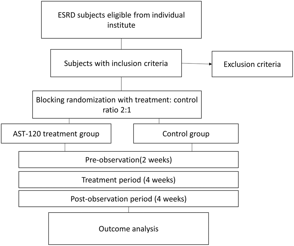 The treatment-to-control ratio in the screening phase was 2:1 with a randomized open-label clinical trial. The inclusion criteria were as follows: (1) ≥ 20 years of age, <100 years of age; (2) has been undergoing hemodialysis three times a week for at least six months (with Kt/V ≥1.2); (3) has continued anti-pruritic treatment (such as oral or intravenous antihistamine or topical cream/ointment for pruritus) for at least three months; (4) AST-120-naïve user; (5) mean visual analog scale (VAS) ≥4 three times in the last week of the pre-observation period; and (6) adequate venous access (has stable functioning arteriovenous fistula, graft, or other venous access).