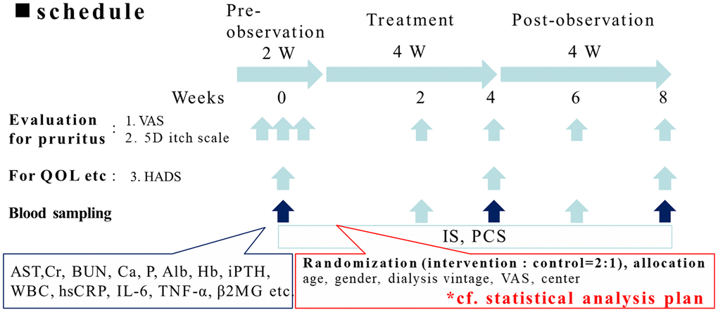All participants underwent pre-observation screenings two weeks before the study with three visits. In the treatment phase (week 1 to week 4). In the treatment phase, the control group received oral or parental antihistamine or topical cream/ointment for pruritus as routine anti-pruritic treatment according to the principle of each institute. The intervention group added 6g/day of AST-120 along with routine anti-pruritic treatment. The participants received two visits at the 2nd and 4th weeks. In the post-observation phase (week 5 to week 8), the participants received two visits, at the 6th and 8th week. The participants underwent evaluation of pruritus during each visit. Assessment of the quality of life was performed in week 1 of the pre-observation screenings, week 4 of the treatment phase, and week 8 of the post-observation phase. Blood sampling was performed in the 1st week of the pre-observation phase and during all visits in the treatment phase and post-observation phases.