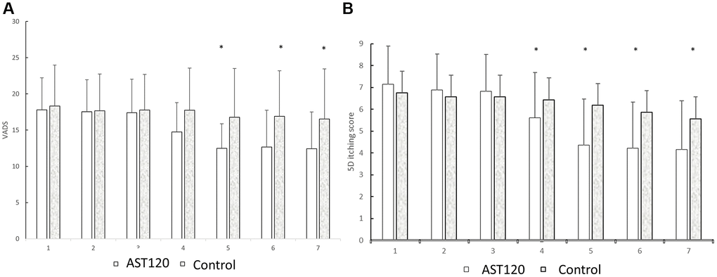 The impact of AST-120 treatment on VADS and 5D itch scores
