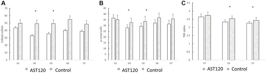 Figure 4 illustrates the comparison of indoxyl sulfate, p-cresol sulfate, and TNF-α levels between the AST-120 group and the control group from the 3rd to the 7th visit. AST-120 treatment led to a significant decrease in indoxyl sulfate (A) and p-cresol sulfate (B) levels at the 4th and 5th visits. Furthermore, TNF-α (C) levels exhibited a significant decrease in the 5th and 7th visits.