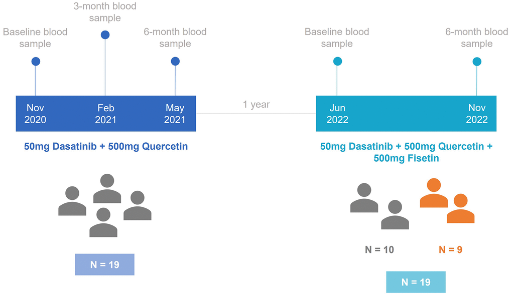 Therefore, this study aims to comprehensively assess the impact of senolytic drugs on epigenetic aging through two longitudinal studies to address our research objective. The initial investigation focuses on a combination treatment of Dasatinib and Quercetin, while the subsequent phase incorporates Fisetin into the treatment regimen. The hypothesis of this prospective non-randomized clinical study posits that the combined administration of Quercetin and Dasatinib over 6 months will effectively decelerate participants’ epigenetic biological aging, as measured at baseline, halfway point, and post-trial assessments. We anticipate that the synergy between Quercetin and Dasatinib will lead to a significant reduction in cell proliferation, thereby slowing the rate of aging and contributing to the improvement of the participants’ overall epigenetic aging profile. This pilot study aims to establish the safety, efficacy, and feasibility of Quercetin and Dasatinib as a potential treatment to enhance the clinical care of healthy individuals, with the ultimate goal of extending longevity by mitigating the progression of epigenetic aging. The inclusion of Fisetin in the second treatment regimen had the aim of identifying differences in the effect of different senolytic drugs on epigenetic aging. This comprehensive approach will provide insights into how senolytic drugs influence epigenetic dynamics and contribute to our understanding of potential interventions in the process of senescence.