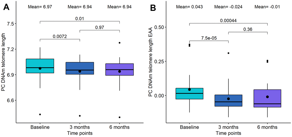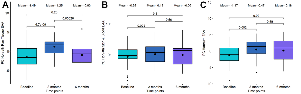 | The first three columns show the mean values for each EAA clock at each time point. The next columns have information about the t-test between baseline and 3-month test, between baseline and 6-month test, and between 3-month and 6-month tests, respectively. In bold, the significant associations are highlighted. | |||||||||||||||||||||||||||||||||||||||||||||||||||||||||||||||||||||||||||||||||||||||||||||||||||