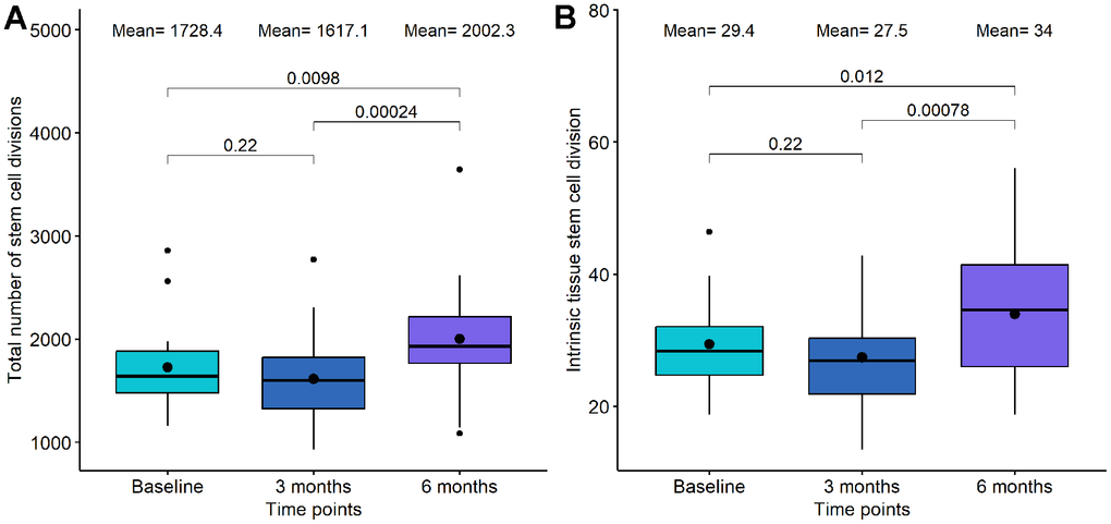 Mitotic clock metrics were also employed to evaluate relative changes in stem cell replication. At the 3-month mark of DQ treatment, we observed a decrease in both the total number of stem cell divisions and the intrinsic tissue stem cell divisions, although these changes were not statistically significant (p-value=0.22 and p-value=0.22, respectively, see Figure 4). However, between 3-month and 6-month points, a significant increase was evident in both mitotic clocks (p-value=2.4·10-4 and p-value= 7.8·10-4, respectively). In the case of DQF treatment, no significant differences were found between the baseline and the 6-month measurement.