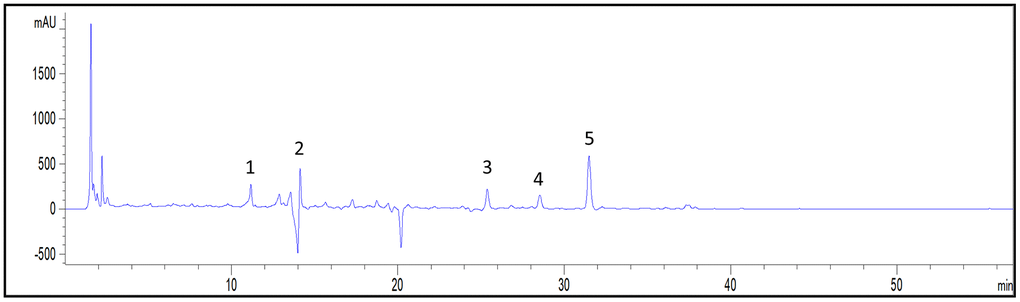 The herbal raw materials of LSF were sourced from the First Affiliated Hospital of Zhejiang Chinese Medicine University. LSF lyophilized powder was obtained following the processes of decoction, concentration, and freeze-drying. High-performance liquid chromatography (HPLC) was employed to determine the contents of representative chemical components in LSF, ensuring their stability and reproducibility. The HPLC analysis revealed the presence of five main chemical constituents in LSF: 1. Cimicifugoside; 2. Notopterol; 3. Compound Glycyrrhizin; 4. Atractylodin; 5. Osthole (Figure 1). Additionally, the contents of these major chemical components were quantified by comparing them with the corresponding standards, as presented in Table 2.