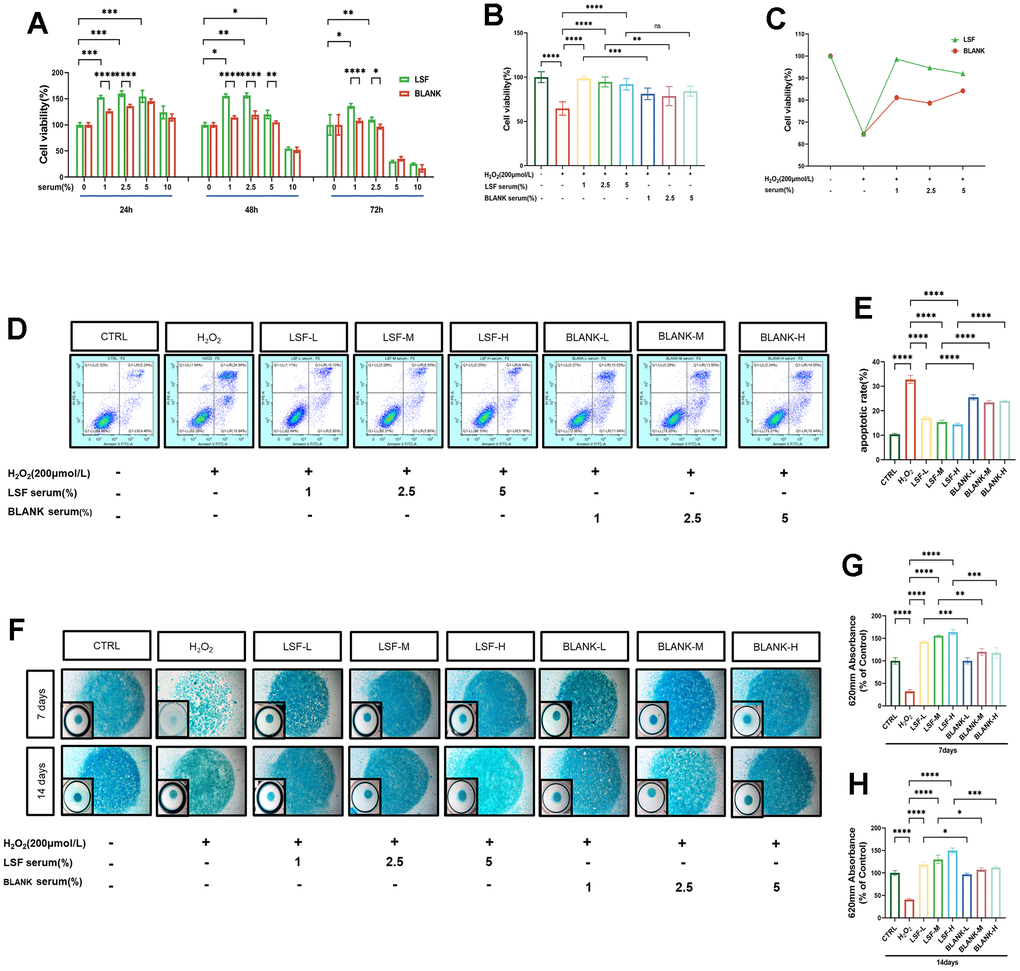 Mice primary chondrocytes were pre-treated with the aforementioned LSF-containing serum concentrations (0%, 1%, 2.5%, 5%) for 24 hours. Subsequently, they were stimulated with H2O2 at concentrations as previously determined for 24 hours (details shown in Supplementary Figure 1). Cell viability was assessed using the CCK-8 assay. As depicted in Figure 2B, 2C, the viability of H2O2-stimulated chondrocytes markedly decreased. LSF exhibited a dose-dependent reversal of this trend, displaying superior efficacy compared to the same concentration of the blank serum group.