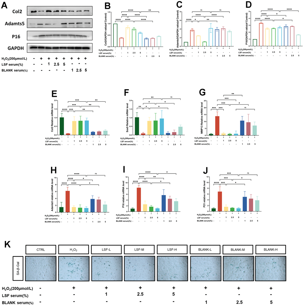 Previous studies have identified Col2, Sox9, Adamts5, and MMP13 as critical markers in regulating the balance between anabolism and catabolism in chondrocytes. Conversely, elevated expressions of P16, P21, and increased β-galactosidase activity are characteristic features of cellular senescence. In our qPCR analysis (Figure 3E, 3F), we observed a significant reduction in mRNA expression levels of Col2 and Sox9 in the H2O2-stimulated group. Additionally, the results (Figure 3G–3J) revealed a noteworthy increase in mRNA expression levels of Adamts5, MMP13, P16, and P21, all of which were effectively reversed by LSF. To delve deeper into LSF’s role in regulating anabolic catabolism and inhibiting cellular senescence in H2O2-stimulated chondrocytes, we conducted Western blotting to measure the protein expression of Col2, Adamts5, and P16. As depicted in (Figure 3A–3D), the protein expression of Col2 was significantly reduced in the H2O2-stimulated group. Conversely, protein levels of Adamts5 and P16 were markedly increased. Notably, LSF treatment effectively counteracted these alterations, aligning with the qPCR findings. Additionally, SA-β-gal staining revealed a considerable increase in blue coloration in the H2O2-stimulated group, indicating elevated β-galactosidase activity. LSF treatment demonstrated a significant improvement in this aspect (Figure 3K).