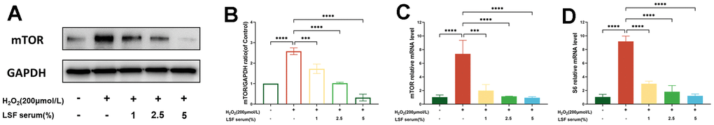 mTOR, a protein kinase intricately linked to cell proliferation, growth, and differentiation, is known to play a pivotal role in regulating apoptosis, autophagy, and cellular senescence. Thus, it becomes crucial to explore whether LSF’s regulation of chondrocyte anabolic-catabolic balance and inhibition of cellular senescence is linked to the mTOR signaling pathway. We initiated this exploration by assessing the expression of mTOR in H2O2-stimulated chondrocytes via Western blotting. Strikingly, mTOR proteins exhibited significantly heightened expression. However, in chondrocytes pre-treated with LSF, this trend was dose-dependently reversed by LSF (Figure 4A, 4B). To substantiate this finding, we conducted qPCR to measure the expression of mTOR and its downstream S6 gene. Encouragingly, the results mirrored the Western blotting findings (Figure 4C, 4D). Collectively, LSF holds promise in inhibiting cellular senescence and regulating chondrocyte anabolic-catabolic homeostasis through the mTOR signaling axis.
