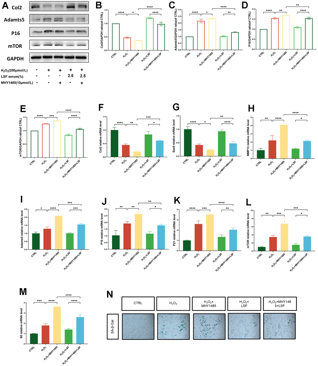 To elucidate the impact of mTOR on H2O2-stimulated chondrocyte anabolic catabolism in vitro, we treated chondrocytes stimulated with H2O2 with the mTOR activator MHY1485 (10μM). Remarkably, Col2 expression was significantly suppressed in the H2O2+MHY1485 conditioned group, accompanied by increased expression of Adamts5, P16, and mTOR (Figure 5A–5E). Subsequently, we assessed the mRNA expression levels of genes associated with anabolic catabolic phenotype, senescence phenotype, and the mTOR signaling pathway in chondrocytes using qPCR. As depicted in Figure 5F–5M, the mRNA expression of Col2 and Sox9 was notably suppressed in cells subjected to H2O2+MHY1485 conditioning. Conversely, the mRNA expression of Adamts5, MMP13, P16, P21, mTOR, and S6 was heightened in the same group. Importantly, this trend was reversed in chondrocytes pretreated with LSF. Additionally, we performed SA-β-gal staining, which displayed a substantial increase in blue coloration and β-galactosidase activity in cells subjected to H2O2+MHY1485 conditioning. Strikingly, LSF ameliorated this effect (Figure 5N). Collectively, these findings suggest that suppressing the activation of the mTOR signaling axis could potentially reduce cellular senescence and mitigate osteoarthritis-associated chondrocyte catabolism, promoting an anabolic phenotype.