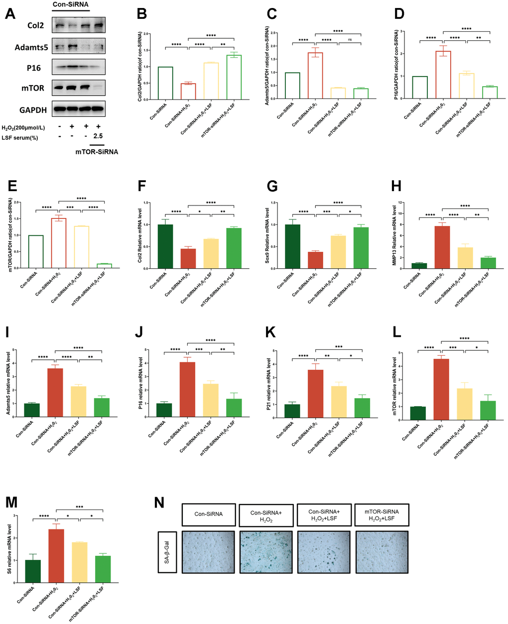 To validate the protective effect of LSF-triggered mTOR pathway on H2O2-stimulated chondrocytes, we transfected mTOR-siRNA into chondrocytes. Subsequently, Western blotting was employed to assess the expression of mTOR, Col2, Adamts5, and P16 in chondrocytes post transfection. As illustrated in Figure 6A–6E, mTOR protein expression in the mTOR-siRNA group was significantly reduced. Notably, Col2 expression was significantly up-regulated, and the expression levels of Adamts5 and P16 were diminished in the cells following LSF pre-treatment and H2O2 stimulation. Furthermore, qPCR analysis revealed elevated mRNA expression of Col2 and Sox9, whereas mRNA expression of Adamts5, MMP13, P16, P21, mTOR, and S6 was suppressed (Figure 6F–6M). Additionally, SA-β-gal staining was employed, and the results indicated a substantial reduction in blue coloration, signifying a decrease in β-galactosidase activity in the mTOR-siRNA group (Figure 6N). These comprehensive findings underscore that LSF exerts chondroprotective effects by mitigating cell senescence and resisting chondrocyte catabolism, ultimately promoting anabolism through the suppression of the chondrocyte mTOR pathway.