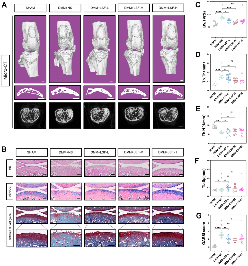 To investigate the potential cartilage-protective effect of LSF in vivo, we established a destabilization of the medial meniscus (DMM)-induced mice model. Micro-CT scans and subsequent 3D reconstructions revealed a significant improvement by LSF in subchondral osteosclerosis and bone redundancy formation in the DMM-induced osteoarthritis mice. Quantitative results from the Micro-CT scans and the 3D reconstructions, including BV/TV, Tb.Th, Tb.N, and Tb.Sp, are presented in Figure 7A, 7C–7F. Histological examination of knee joints using HE, ABH/OG, and Safranin O-Fast Green staining depicted that the articular cartilage in the DMM-induced model mice exhibited structural disorganization, thinning, and defects. LSF intervention effectively rescued these histopathological changes, ameliorating cartilage degradation, increasing cartilage thickness, and promoting surface smoothness, as demonstrated in Figure 7B. The OARSI score was employed to quantify the staining results, illustrated in Figure 7G.