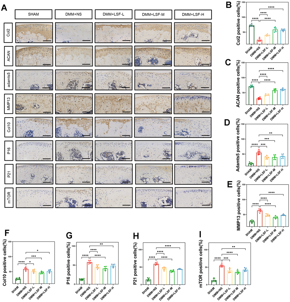Furthermore, immunohistochemistry revealed noteworthy findings. The expression levels of Adamts5, MMP13, Col10, P16, and P21 were significantly elevated, while the expression of Col2 and ACAN was decreased in the DMM group compared to the SHAM group. Interestingly, LSF administration reversed these trends, significantly enhancing cartilage sclerosis and mitigating the extent of cartilage degeneration in the DMM-induced mice, as displayed in Figure 8A–8I.
