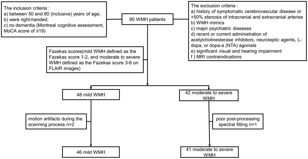 The Ethics Committee of Union Hospital, Tongji Medical College, Huazhong University of Science and Technology approval and informed consent from each subject were obtained prior to study initiation. Ninety individuals, including 48 mild and 42 moderate to severe WMH cases were initially recruited from the neurology clinics of Union Hospital, Tongji Medical College, Huazhong University of Science and Technology. All participants underwent neuropsychological evaluation and MRI scanning. A radiology expert assessed all images based on the Fazekas score [34] (mild and moderate to severe WMH were defined as Fazekas scores of 1–2 and 3–6 on FLAIR images, respectively). Two mild WMH cases with motion artifacts during the scanning process and 1 moderate to severe WMH case with poor post-processing spectral fitting were excluded. Therefore, 46 mild and 41 moderate to severe WMH cases were finally included. All study participants (a) were between 50 and 80 (inclusive) years old; (b) were right-handed; (c) had no dementia (Montreal cognitive assessment, MoCA score ≤19 [35, 36]). Exclusion criteria were: (a) a history of symptomatic cerebrovascular disease or >50% stenosis of intracranial and extracranial arteries; (b) WMH mimics (e.g., neurodegenerative disorders, multiple sclerosis, trauma, infection, poisoning, hypoxic-ischemic encephalopathy, and leukodystrophy); (c) major psychiatric diseases (e.g., severe major depression, severe anxiety, and bipolar disorder); (d) recent or current administration of acetylcholinesterase inhibitors, neuroleptic agents, L-dopa, or dopa-a (nta) agonists; (e) significant visual or hearing impairment; (f) MRI contraindications, e.g., metal implants, pacemakers and claustrophobia. The study flowchart is depicted in Figure 1.