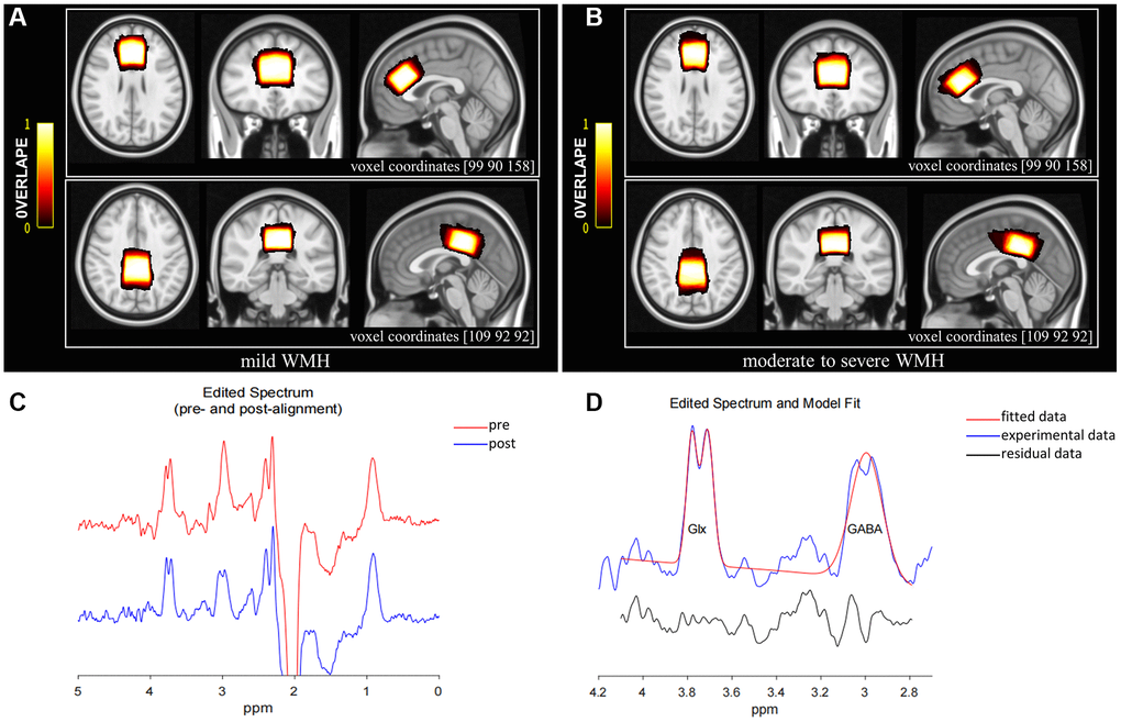 The metabolite data of all participants are shown in Table 2 and Figure 4 GABA+/Cr (p = 0.034) ratios were reduced in the moderate to severe WMH group compared with mild WMH cases, after adjustment for age, gender, and education. However, no significant differences were found in Glx/Cr levels in the ACC (p = 0.676) and in GABA+/Cr (p = 0.302) and Glx/Cr (p = 0.668) levels in the PCC.