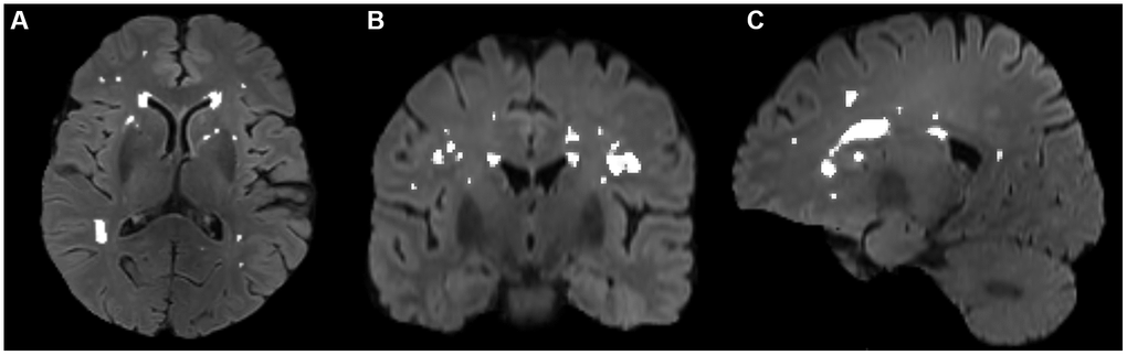 The volumes of white matter hyperintensities were derived with FSL’s Brain Intensity AbNormality Classification Algorithm (BIANCA) [54] following the UK Biobank image processing pipeline [50] and FMRIB’s Automated Segmentation Tool (FAST) [55]. The main procedures included: (a) generating a white matter mask with FAST, (b) generating a WMH mask with BIANCA in T1 space using a threshold of 0.8, which has achieved good segmentation performance according to visual check by an experienced neuro radiologist Dr. Wang, and (c) filtering non-WM voxels in the WMH mask with the white matter mask. Then, segmentation for every patient was manually checked and revised with ITK-SNAP (http://www.itksnap.org/) by Dr. Zhu. A representative segmentation of WMH volume is shown in Figure 3.