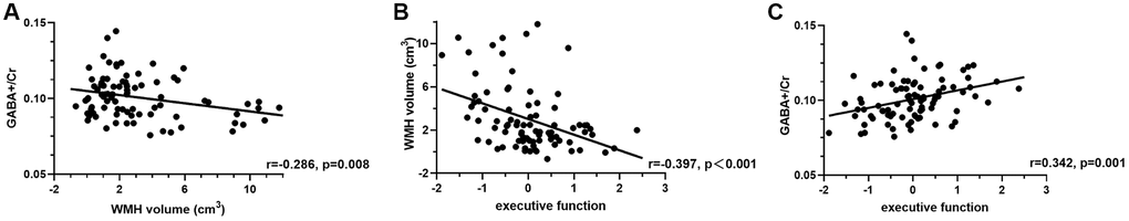 In all WMH patients, a negative correlation was found between WMH volume and GABA levels in the ACC (r = −0.286, p = 0.008, Figure 5A), but not in the PCC (p > 0.05). Glx levels in both regions were not associated with WMH burden in the whole brain (all p > 0.05). WMH burden was negatively correlated with executive function (r = −0.397, p < 0.001, Figure 5B), but not with attention (r = −0.177, p = 0.108) and memory (r = −0.005, p = 0.967).