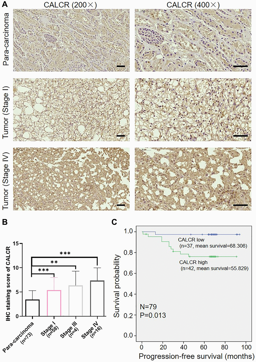 A human tissue microarray chip containing 79 cases of RCC tissues and 73 cases of normal para-carcinoma tissues was used to identify CALCR protein expression through IHC staining. The tumor characters of each patient and the written informed consents were obtained. This study was approved by the Ethics Committee of The First Affiliated Hospital of Harbin Medical University. For IHC staining, tissue slides were dewaxed and rehydrated using xylene and alcohol. Following this, citrate buffer was added to repair antigens, and 3% H2O2 was used to block nonspecific binding sites. The primary anti-CALCR (1:50, Cat No. ab230500, Abcam) and secondary HRP goat anti-rabbit IgG (1:400, Cat No. ab97080, Abcam) were then incubated with tissue slides. Finally, slides were stained with diaminobenzene (DAB) and hematoxylin followed by photographing. Two independent pathologists scored the IHC figures according to Haonon et al. [15]. Briefly, the staining score was determined as product of staining intensity and the percentage of positive tumor cells. Staining intensity was divided into four levels: no staining signals (0), light yellow (1), pale brown (2), seal brown (3). The percentages of positive tumor cells were also divided into 4 levels: 0~24% (1), 25~49% (2), 50~74% (3), 75~100% (4). The product of these scores resulted in the immunoreactive score (IRS) ranged from 0 to 12: 0 score (low expression), 1–3 scores (weak expression), 4–7 scores (moderate expression), 8–12 scores (strong expression).