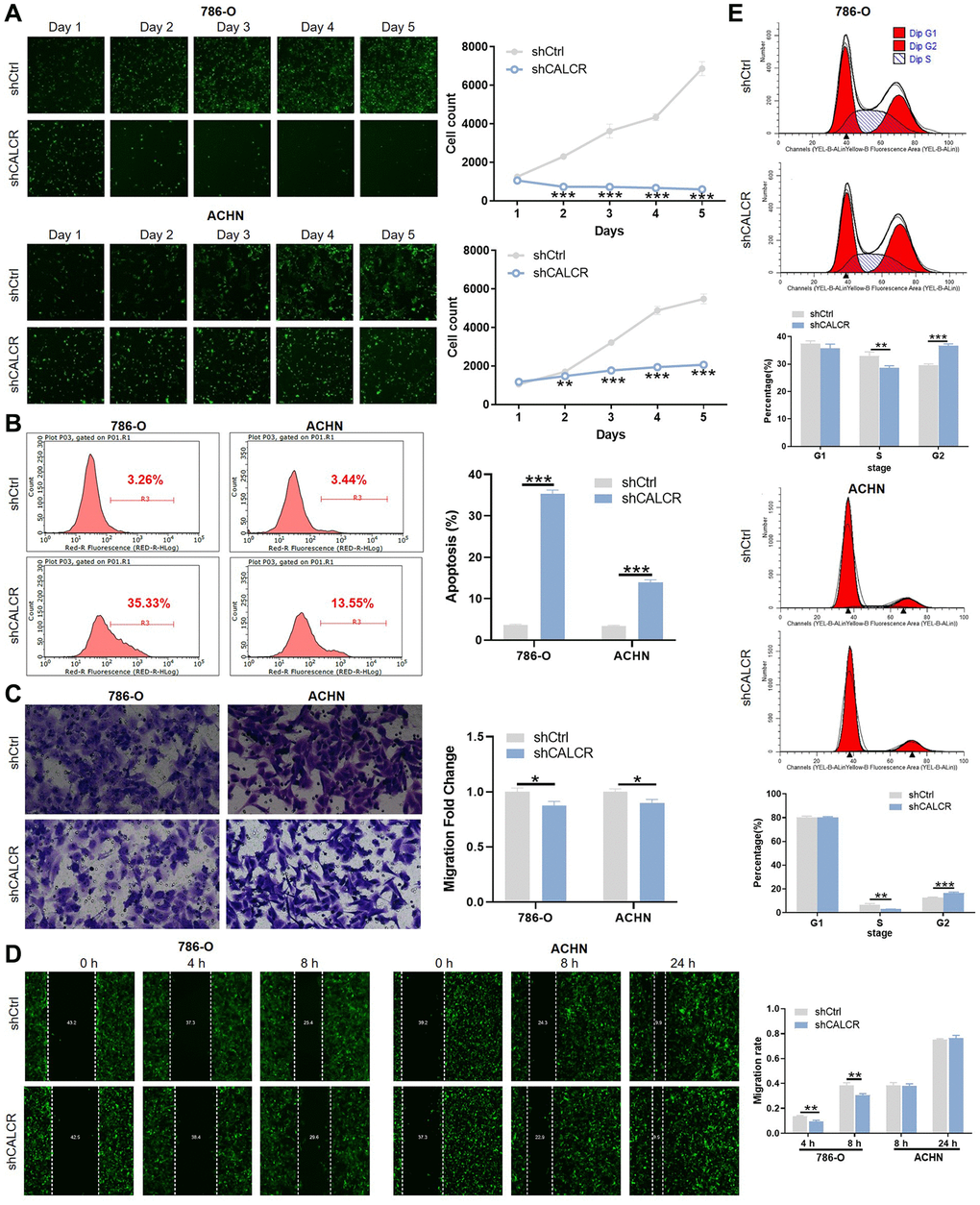 To confirm the biological significance of CALCR in RCC development, we silenced CALCR in 786-O and ACHN RCC cell lines using CALCR shRNAs. According to the results of qPCR assays (Supplementary Figure 1A), shCALCR-2 was identified as the most effective CALCR knockdown shRNA and, accordingly, lentiviruses containing shCALCR-2 sequences were employed consistently throughout the study. As a negative control, a lentiviral vector carrying scramble RNA (shCtrl) was utilized. Further, compared with shCtrl group, the expression levels of CALCR mRNA (P < 0.001, 786-O; P = 0.016, ACHN) and protein in 786-O cells and ACHN cells transfected with shCALCR-2 were down-regulated, indicating that the CALCR knockdown cell model was successfully constructed (Supplementary Figure 1B, 1C). The influence of CALCR on malignant phenotypes of RCC cells, including cell proliferation, anti-apoptosis, migration, were then evaluated. The results of Celigo cell count assay revealed that CALCR knockdown significantly impaired proliferative ability of 786-O and ACHN cells compared to the negative control group (P < 0.001) (Figure 2A). In contrast, CALCR depletion remarkably promoted 786-O and ACHN cells apoptosis, indicating the inhibition role of CALCR on cell apoptosis (P < 0.001) (Figure 2B). Cell migratory alterations were observed by transwell and wound healing assays. As shown in Figure 2C, the transwell assays suggested that migratory capacity of renal cancer cells was apparently attenuated upon CALCR knockdown (P = 0.015, 786-O; P = 0.012, ACHN). The wound healing results of 786-O cells were consistent with those of transwell assays (P =0.004, 4 h; P = 0.007, 8 h) (Figure 2D). In addition, we observed that CALCR depletion arrested 786-O and ACHN cell cycle in G2 phase (P < 0.001, 786-O; P < 0.001, ACHN), whereas significantly decreased the proportion of S-stage cells (P = 0.009, 786-O; P = 0.002, ACHN) (Figure 2E). Collectively, these results suggested that CALCR knockdown could inhibit the oncogenic features of malignant proliferation and migration in RCC cells, and induce cell apoptosis and cell cycle arrest.