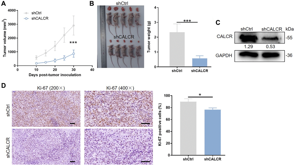 To identify whether CALCR is essential for in vivo tumor formation, the ACHN cells with CALCR stable knockdown were subcutaneously injected into flank area of nude mice. 10 days after cell inoculation, tumor volume was obtained for generating a tumor growth curve. As shown in Figure 3A, tumors from mice in shCALCR group were slower growing than that in shCtrl group (P < 0.001). Consistently, the tumor weight of shCALCR group mice was apparently lighter compared to the tumor weight of shCtrl group mice (P < 0.001) (Figure 3B). The western blot assays of tumor tissues showed that CALCR was effectively knocked down relative to the corresponding control group (Figure 3C). By performing Ki-67 staining of tumor tissues, we found that the downregulation of CALCR accompanied a reduction in expression of Ki-67 (P = 0.016), implying the inhibition of CALCR on tumor cell proliferation (Figure 3D). Taken together, we demonstrated that CALCR was critical for in vivo tumor growth of RCC cells.