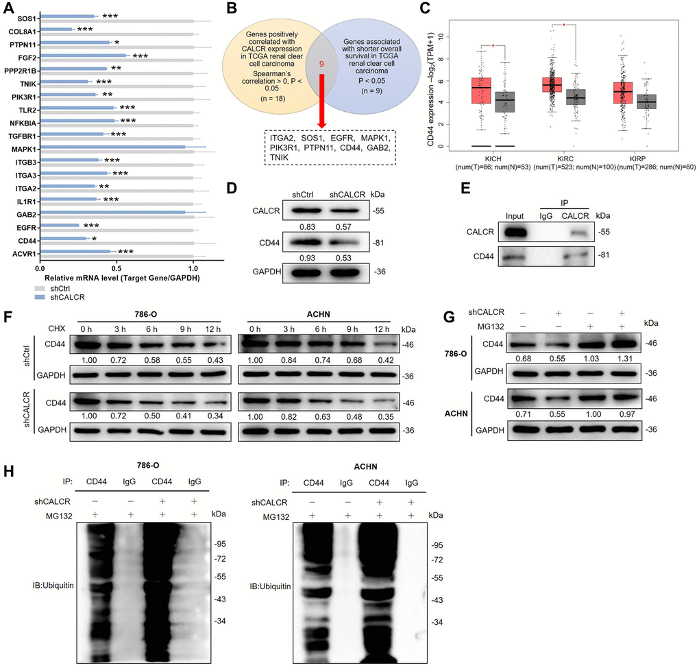 To gain an in-depth mechanistic view of CALCR-induced RCC progression, we further examined potential proteins that could interact with CALCR. The results of human gene expression profiling microarray sequencing suggested that a total of 403 genes were upregulated and 1011 genes were downregulated along with CALCR depletion (Supplementary Figure 1D, 1E). By qPCR analysis, we validated the differential expression of top-ranked 19 DEGs (Figure 4A). Furthermore, we conducted correlation analyses between these 19 DEGs and CALCR, as well as prognostic assessments correlating with these 19 DEGs with overall survival, utilizing The Cancer Genome Atlas (TCGA) renal clear cell carcinoma data (https://portal.gdc.cancer.gov/). The results showed that 9 DEGs (ITGA2, SOS1, EGFR, MAPK1, PIK3R1, PTPN11, CD44, GAB2, TNIK) were simultaneously positively correlated with CALCR expression, and were associated with shorter overall survival in renal clear cell carcinoma patients (Figure 4B). Subsequently, we assessed the differential expression of these 9 genes in KICH, KIRC, and KIRP from TCGA cohort through GEPIA (http://gepia2.cancer-pku.cn). Notably, CD44 emerged as the only gene consistently showing elevated expression across all three renal cancer types, with statistically significant differences in TCGA-KICH and TCGA-KIRC (Figure 4C). CD44 has been implicated in various cancers, including its role as a potential prognostic marker in RCC [17, 18]. Therefore, we selected CD44 as a key target for CALCR in renal cancer progression. Furthermore, the western blotting was used to investigate CD44 expression after CALCR knockdown in renal cancer cell, and we found that CD44 protein expression was inhibited upon CALCR depletion (Figure 4D). These findings collectively emphasize CD44 as a critical target through which CALCR promotes renal cancer progression.