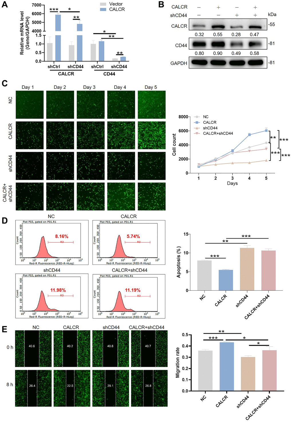 Given the regulatory effect of CALCR on CD44 expression, we further explored whether the tumor promotion of CALCR required CD44 expression. We generated the shRNAs targeting CD44 and screened shCD44-1 with the best knockdown efficiency to downregulate CD44 expression in CALCR-overexpressed 786-O cells (Supplementary Figure 1F), and detected the promoting role of CALCR on RCC cells. The mRNA and protein expression level of CALCR and CD44 was confirmed in cells transfected with CALCR and shCD44 (Figure 5A, 5B). The Celigo cell count assay showed that CD44 knockdown significantly impaired CALCR-induced cell proliferation (CALCR + shCD44 group vs. CALCR group, P < 0.001) (Figure 5C). Conversely, the inhibition of CALCR on renal cancer cell apoptosis was remarkably attenuated by depleting CD44 expression (CALCR + shCD44 group vs. CALCR group, P < 0.001) (Figure 5D). In addition, the wound healing assay revealed that CD44 deficiency decreased the cell migration ability promoted by CALCR (CALCR + shCD44 group vs. CALCR group, P = 0.027) (Figure 5E). These rescue experiments suggested CD44 was indispensable for CALCR-induced RCC development.
