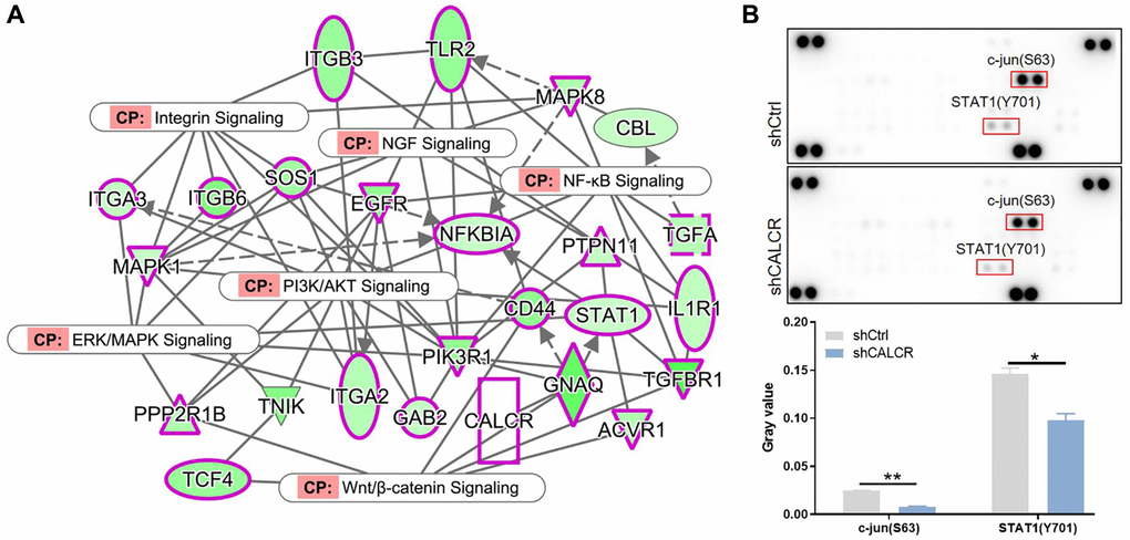 To gain more insight of mechanism by which CALCR exacerbates renal cancer progression, the possible signaling pathways involved in this process was explored. We performed the interaction network analysis based on ingenuity pathway analysis (IPA) software, the results suggested that CALCR could indirectly affect NF-κB signaling, integrin signaling, PI3K/AKT signaling, ERK/MAPK signaling, Wnt/β-catenin signaling and NGF signaling through other intermediate molecules (Figure 6A). Moreover, we further analyzed the phosphorylation levels of 37 kinases using a human phospho-kinase array. We found that the phosphorylation of c-jun (P = 0.002) and STAT1 (P = 0.032) was significantly inhibited in CALCR-depleted cells compared to the respective control cells (Figure 6B), reminding that c-jun and STAT1 related signaling pathways may be involved in CALCR induced renal carcinoma development. The c-Jun N-terminal Kinases (JNKs) are members of the mitogen-activated protein kinase (MAPK) family and have been identified as a key oncogenic signaling nodes in several cancers [15]. STAT1 is a transcription factor belonging to the signal transducer and activator of transcription (STAT) family. In response to cytokines, STAT1 functions as a tumor suppressor or tumor promoter in various cancer types [20]. Therefore, we inferred that the JNK and STAT1 signaling were possible signaling pathways that contributed to CALCR-mediated RCC progression.