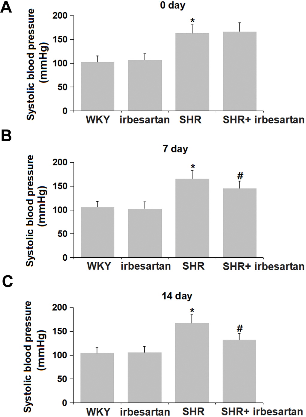 After one week of adaption, WKY and SHR rats were orally dosed with normal saline or 20 mg/kg/day Irbesartan (#138402-11-6, Sigma-Aldrich, China) for 14 consecutive days, with four groups divided shown as below: WKY, Irbesartan, SHR, SHR+ Irbesartan.