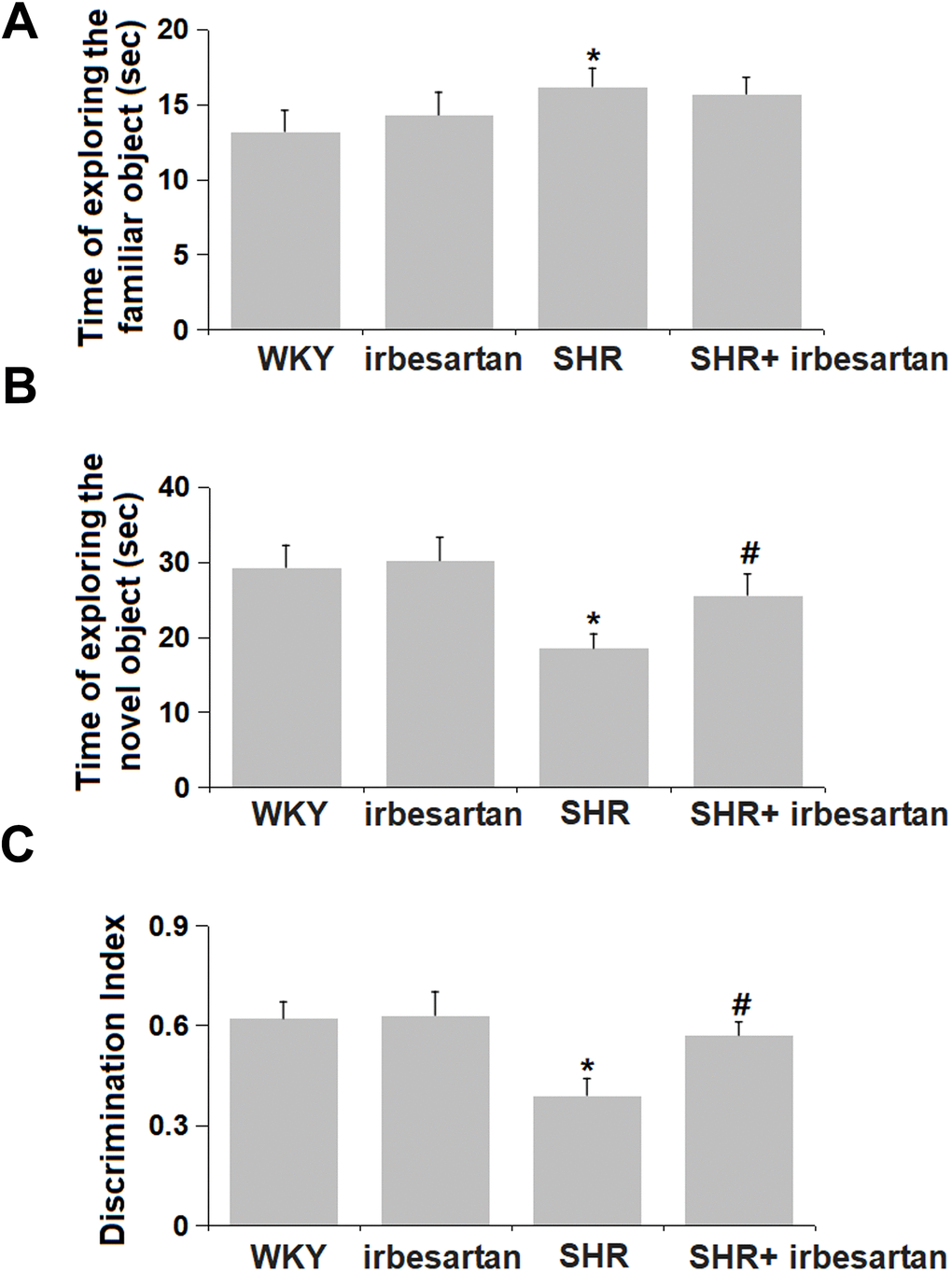 ORT was performed on each rat for the evaluation of memory function. The time of exploring the familiar object in the WKY, Irbesartan, SHR, and SHR+ Irbesartan groups was 13.2, 14.3, 16.2, and 15.7 sec, respectively, with minor between-group differences (Figure 2A). However, the time of exploring the novel object was slightly changed from 29.3 sec to 30.2 sec in the Irbesartan group, was markedly declined to 18.5 sec in the SHR group, and then notably increased to 25.6 sec in the SHR+ Irbesartan group (Figure 2B). Furthermore, the discrimination index in the WKY, Irbesartan, SHR, and SHR+ Irbesartan groups was 0.62, 0.63, 0.39, and 0.57, respectively (Figure 2C). Irbesartan showed a promising protective effect against impaired memory function in SHR rats.