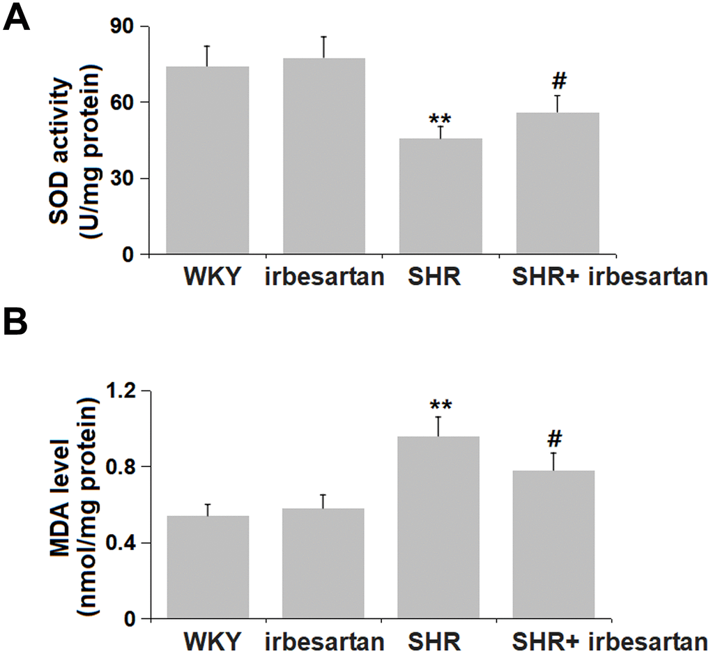 OS is a critical factor involved in the progression of hypertension-induced cognitive impairment [16]. The SOD activity in the hippocampus was found slightly altered from 74.2 to 77.6 U/mg protein in the Irbesartan group, markedly reduced to 45.6 U/mg protein in the SHR group, then notably reversed to 56.1 U/mg protein by Irbesartan (Figure 4A). Moreover, the MDA level in the hippocampus in the WKY, Irbesartan, SHR, and SHR+ Irbesartan groups was 0.54, 0.58, 0.96, and 0.78 nmol/mg protein, respectively. A repressive property of Irbesartan against OS in the hippocampus was observed in SHR rats.
