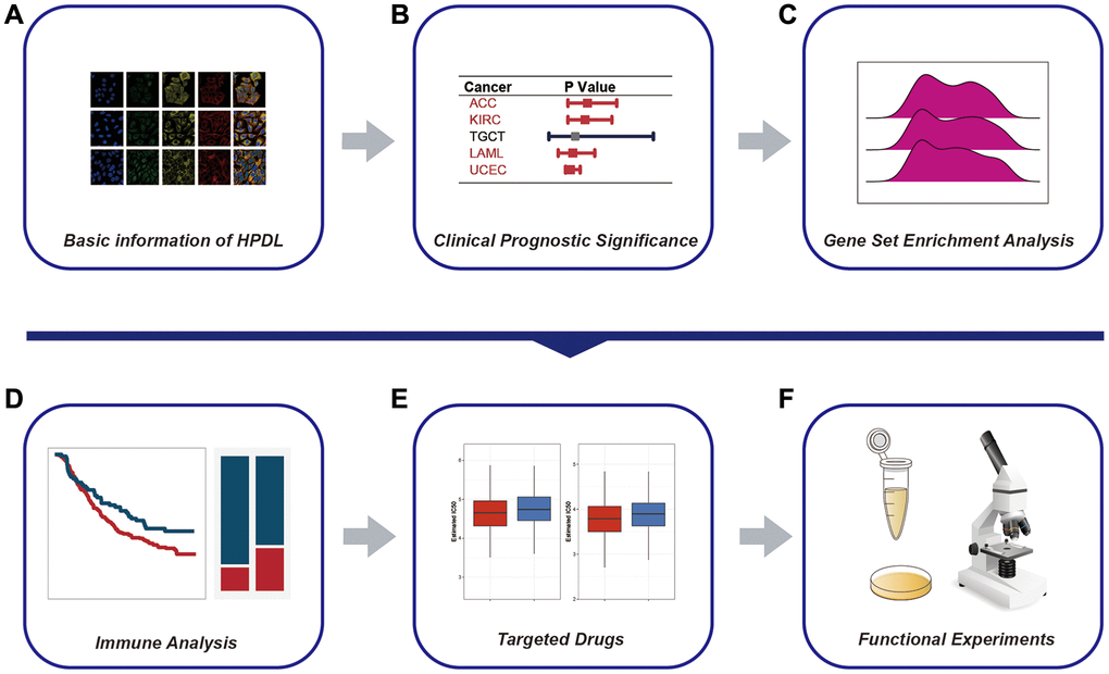 Figure 1 is the workflow of the study. To clarify the patterns of HPDL expression in different types of cancer, we combined TCGA databases and performed a comprehensive analysis on the levels of HPDL mRNA expression in a diverse range of malignant diseases. The results showed increased HPDL levels in 21 different types of tumors, such as BLCA, BRCA, CESC, CHOL, COAD, DLBC, ESCA, LAML, LIHC, LUAD, LUSC, OV, PAAD, READ, SARC, SKCM, STAD, TGCT, THYM, UCEC, and UCS. Conversely, reduced HPDL expression was detected in six tumors, specifically GBM, KIRC, KIRP, LGG, PRAD, and THCA (Figure 2A). Similar outcomes were identified in paired tissue samples. Remarkably, HPDL expression was markedly raised in PAAD, which may be attributable to its function in safeguarding cells from oxidative stress by promoting glutamine metabolism [3]. In line with prior research, these results indicated a discrepancy in HPDL expression in cancerous conditions.