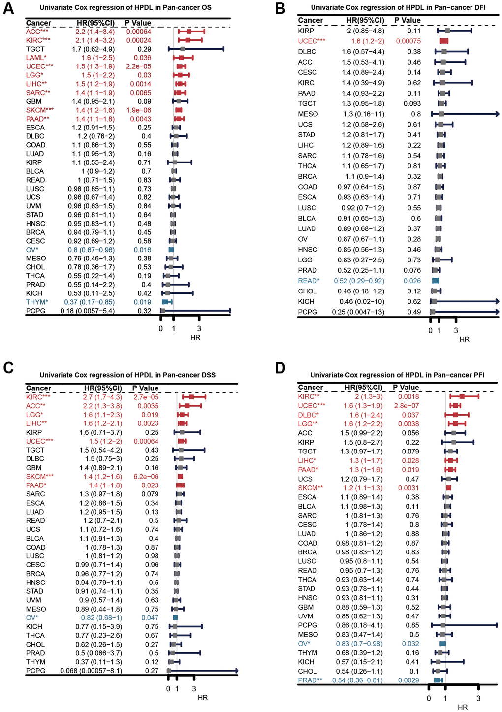 Next, we carried out an extensive investigation into the predictive significance of HPDL in a comprehensive study encompassing various forms of malignancies. Individually, we assessed the rates of survival, including overall survival (OS, shown in Figure 3A), disease-free interval (DFI, illustrated in Figure 3B), disease-specific survival (DSS, depicted in Figure 3C), and progression-free interval (PFI, presented in Figure 3D). To reduce the impact of perplexing prejudices, the researchers utilized univariate Cox regression. First, HPDL acted as an overall survival predictive gene for the survival of ACC, KIRC, LAML, UCEC, LGG, LIHC, SARC, SKCM, PAAD, OV, and THYM. Further evaluation of disease-free survival demonstrated HPDL to be a standalone prognostic gene in UCEC and READ. HPDL emerged as a standalone prognostic gene in the examination of disease-specific survival across KIRC, ACC, LGG, LIHC, UCEC, SKCM, PAAD, and OV. The analysis of PFI revealed that HPDL acted as a standalone prognostic gene in KIRC, UCEC, DLBC, LGG, LIHC, PAAD, SKCM, OV, and PRAD. When the hazard ratio is greater than one, HPDL acts as a prognostic risk factor for poor survival in most cancer instances. The complexity and diversity in the prediction of cancer outcomes using HPDL varied across different types of cancer. Further inquiries should prioritize examining the involvement of the HPDL protein in cancerous cells.