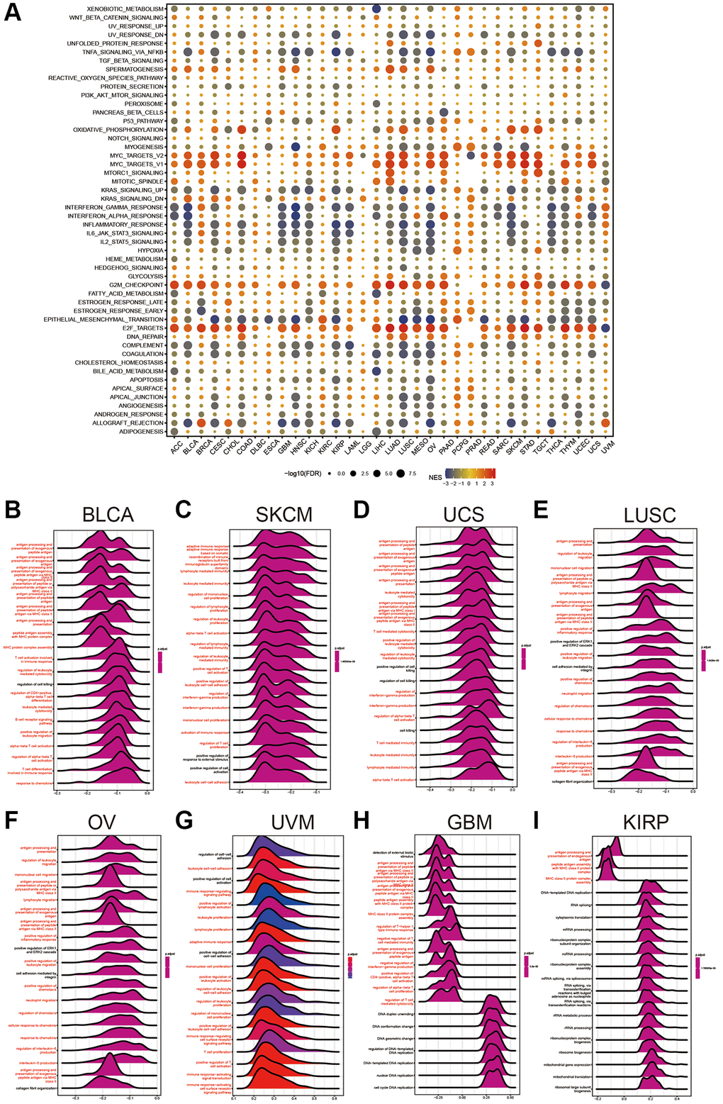 The file ‘h.all.v7.4.symbols.gmt’, containing 50 hallmark gene sets, was acquired from the Molecular Signatures Database (MSigDB, https://www.gsea-msigdb.org/gsea/index.jsp). Normalized Enrichment Score (NES) and False Discovery Rate (FDR) for each cancer type were calculated by using this file to analyze the biological processes associated with them. For each cancer type, we obtained the 20 most important HPDL pathways. To generate GSEA visualizations for the most dominant immune pathways in the top 8 cancer types, we employed the ‘ggridges’ tool available at https://wilkelab.org/ggridges/. The R software packages ‘clusterProfiler’ and ‘GSVA’ [20, 21] were employed to perform gene set enrichment analysis. The condensed findings are displayed in a bubble chart created using the R library ‘ggplot2’.