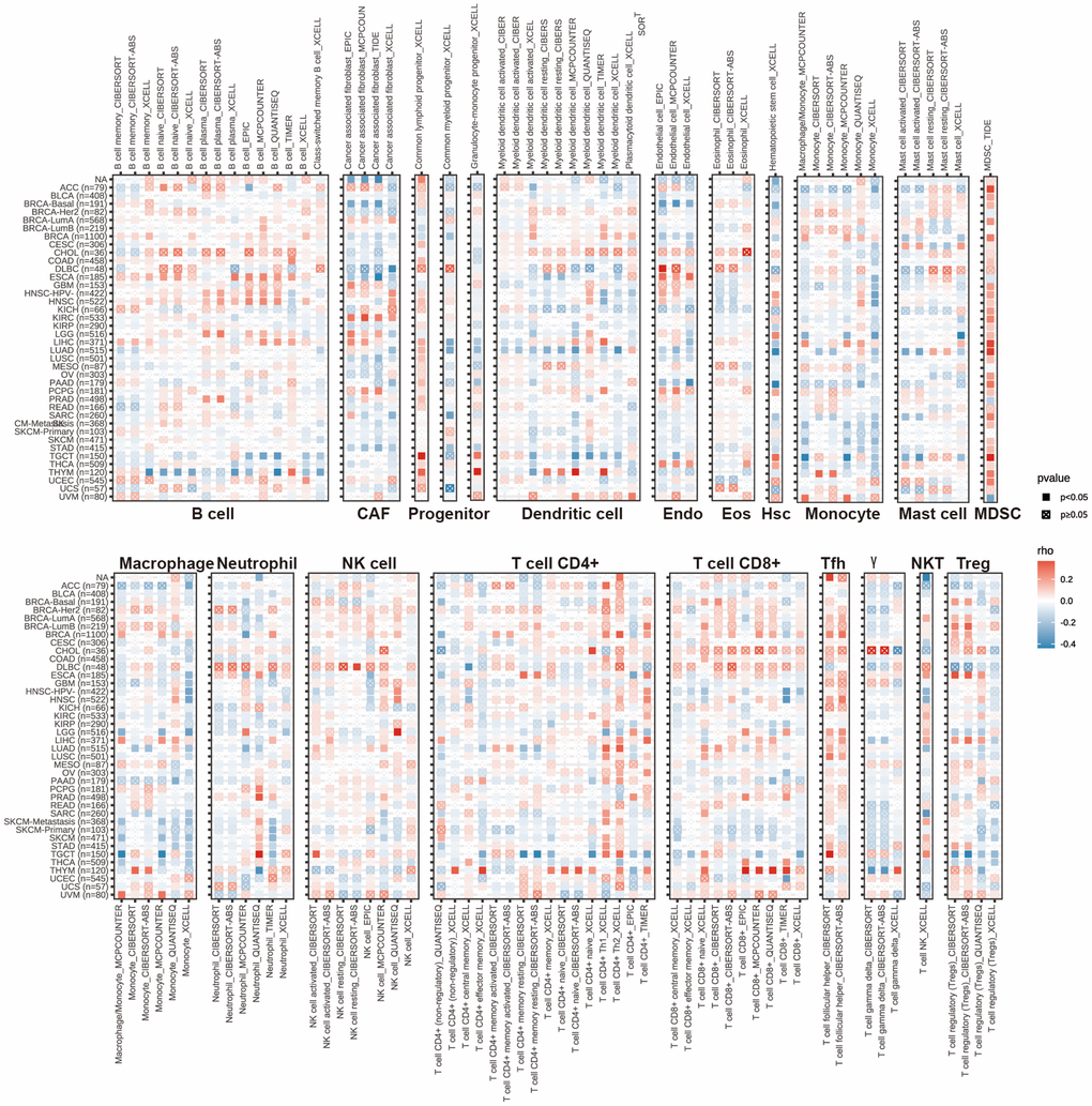 Following the analysis of the aforementioned findings, we explored the correlations between HPDL expression and the level of immune cell infiltration in different types of cancer. We utilized the TIMER2.0 database, which encompasses various quantitative platforms for investigating immune infiltration in cancer research, to exhibit the association between HPDL and the infiltration of immune cells. The findings indicate the levels of infiltration of various cell types, including CD4+ T cells, cancer-associated fibroblasts (CAFs), lymphoid progenitors, myeloid progenitors, endothelial cells (Endo), eosinophils (Eos), hematopoietic stem cells (HSCs), follicular helper T cells (Tfhs), gamma delta T cells (g/dT), natural killer T cells (NKTs), regulatory T cells (Tregs), myeloid-derived suppressor cells (MDSCs), neutrophils, monocytes, B cells, dendritic cells, macrophages, mast cells, NK cells, and CD8+ T cells, in pancancer (Figure 5).