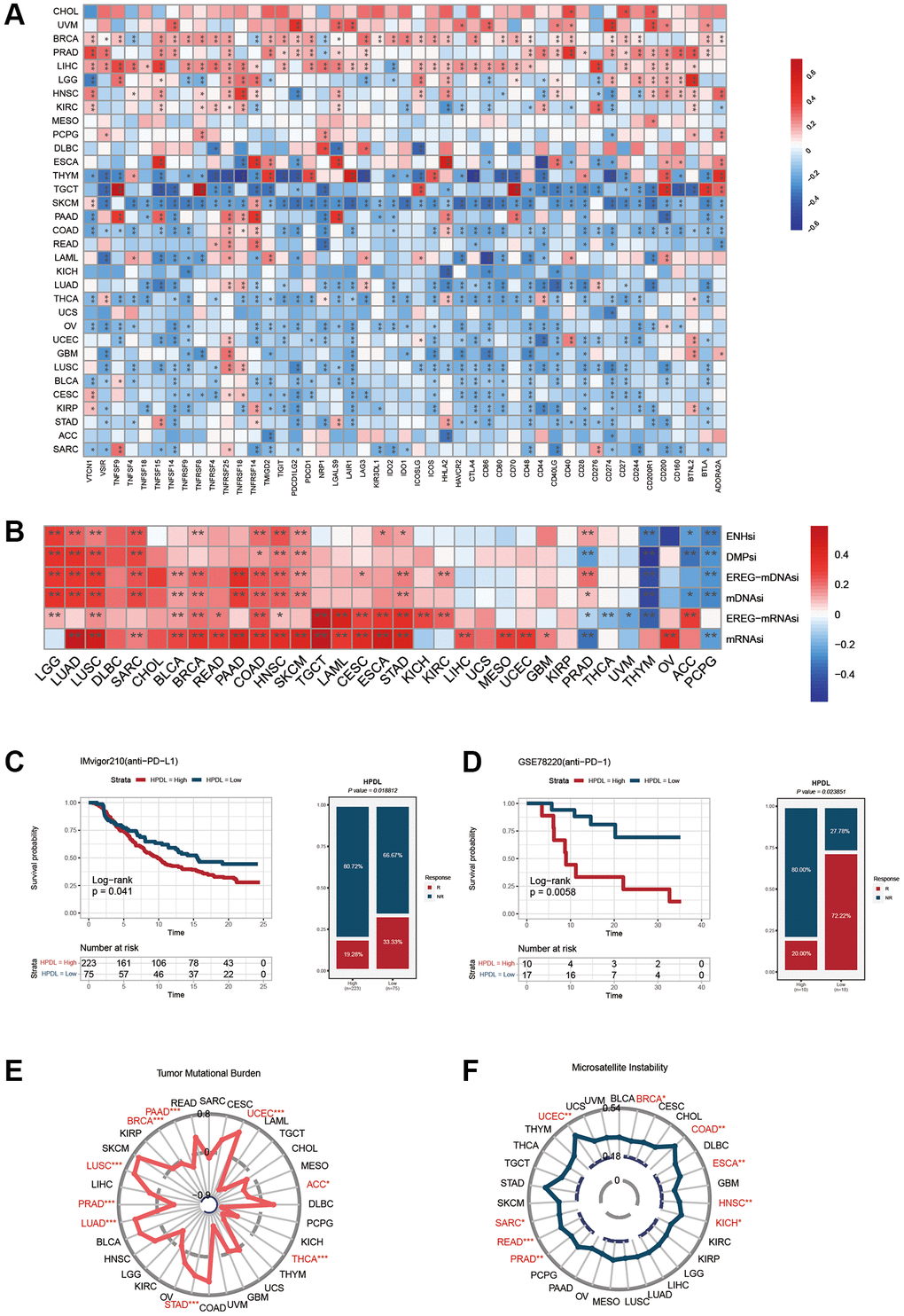 For each type of cancer, Spearman correlation analysis was conducted to determine the connections between HPDL and the documented cancer immunotherapy biomarkers. The correlation between HPDL and tumor mutational burden (TMB) as well as microsatellite instability (MSI) was examined in pancancer through Spearman correlation analysis. To investigate the correlation between HPDL and the efficacy of immune checkpoint blockade (ICB) therapy, two sets of ICB treatments were acquired to confirm the predictive capability of HPDL in the response to immunotherapy. In the IMvigor210 [7] study, 298 patients with urological cancer received atezolizumab (anti-PDL1), while the GSE78220 [23] dataset comprised transcriptomic profiles of 27 melanoma patients prior to nivolumab treatment (anti-PD1). The patients were categorized into two groups based on their HPDL expression levels: one group had low expression, while the other had high expression. The categorization was performed by utilizing the optimal threshold value with the ‘surv-cutpoint’ characteristic of the ‘survminer’ R package. To assess the disparity in response rates between the cancer groups with low-HPDL and high-HPDL, a chi-square test was employed.