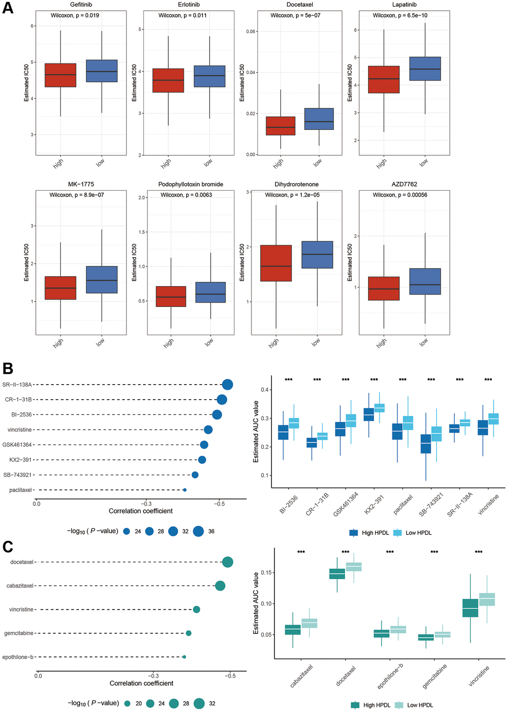 On the basis of the aforementioned clues, we investigated the ability of HPDL to predict chemotherapy reactions in LUAD. Our research revealed that the High-HPDL group showed increased vulnerability to eight frequently used chemotherapy drugs, gefitinib, erlotinib, docetaxel, lapatinib, MK-1775, podophyllotoxin bromide, dihydrorotenone, and AZD7762 (Figure 7A).