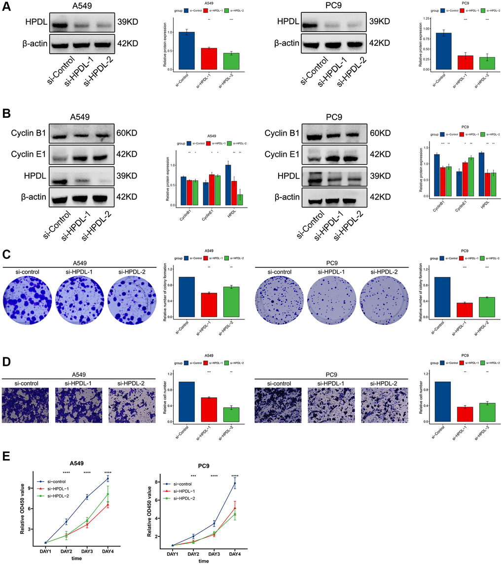 To investigate the role of HPDL, we utilized specific siRNAs to suppress gene expression in A549 and PC9 cells. Two siRNAs targeting the coding region of HPDL were tested for their knockdown efficiency (Figure 8A). According to WB analysis, the reduction in HPDL resulted in an increase in the expression of cyclin E1 while also causing a decrease in the expression of cyclin B1 (Figure 8B). From our prior analysis of gene sets, we observed a significant enrichment of the pathway associated with cell division. The abovementioned results validated that HPDL has the potential to regulate the cell cycle pathway in LUAD (Figure 8B).