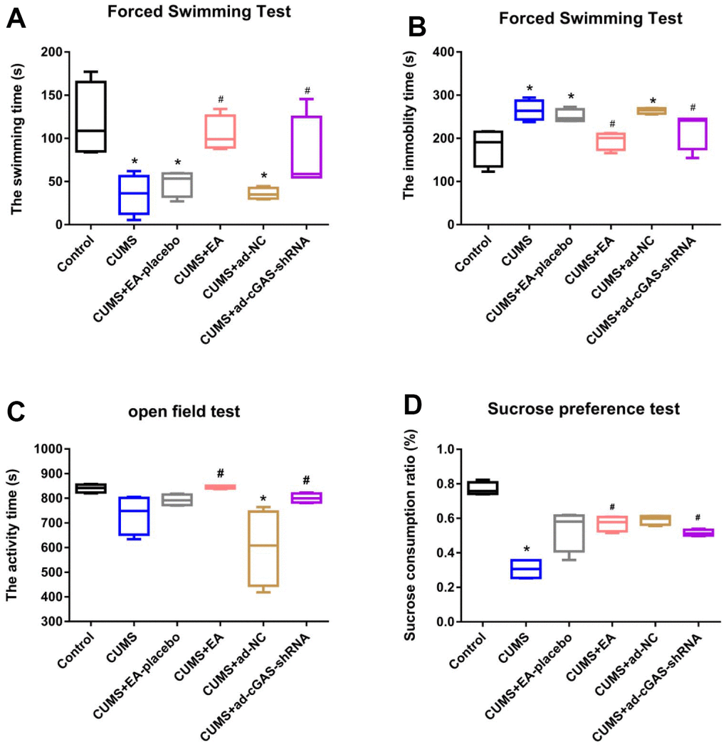 Firstly, we determined the effect of EA intervention on depression-like behavior in depressed mice. The behavioral effects of EA on depressed mice were evaluated by field experiment, forced swimming test, and sucrose preference test at 28 days after CUMS modeling. In the forced swimming test (Figure 1A, 1B), compared to the control group, the forced swimming time of mice in the CUMS group was significantly reduced, and the floating time was greatly increased, which were dramatically reversed by the treatment of EA or the transfection of shRNA-cGAS. As shown in Figure 1C, significantly declined activity time was observed in the CUMS group, which was greatly elevated in the CUMS+EA and CUMS+ ad-cGAS-shRNA groups. In the sucrose preference test, the sucrose preference of mice in the CUMS group was significantly suppressed, which was greatly activated in the CUMS+EA and CUMS+ ad-cGAS-shRNA groups (*p<0.05 vs control, #p<0.05 vs CUMS). These results confirmed the anti-depressant effect of EA in a mouse model of depression, which might be related to the expression of cGAS.