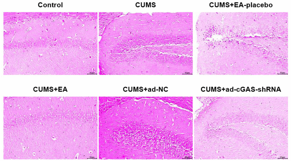 HE staining was used to analyze the effect of EA intervention and cGAS interference on the pathological damage of hippocampus in depressed mice. As shown in Figure 2, in the CUMS group, the hippocampal neurons were significantly damaged, including cell swelling, nuclear shrinkage, and vacuole. In the CUMS+EA-placebo group, the hippocampal neurons were severely damaged, while in CUMS+EA and CUMS+ ad-cGAS-shRNA groups, the damaged hippocampal neurons were repaired, and the cell edema and vacuole were alleviated. These data revealed that EA and knockdown of cGAS effectively reversed the pathological damage in the hippocampal tissue in mice induced by CUMS modeling.