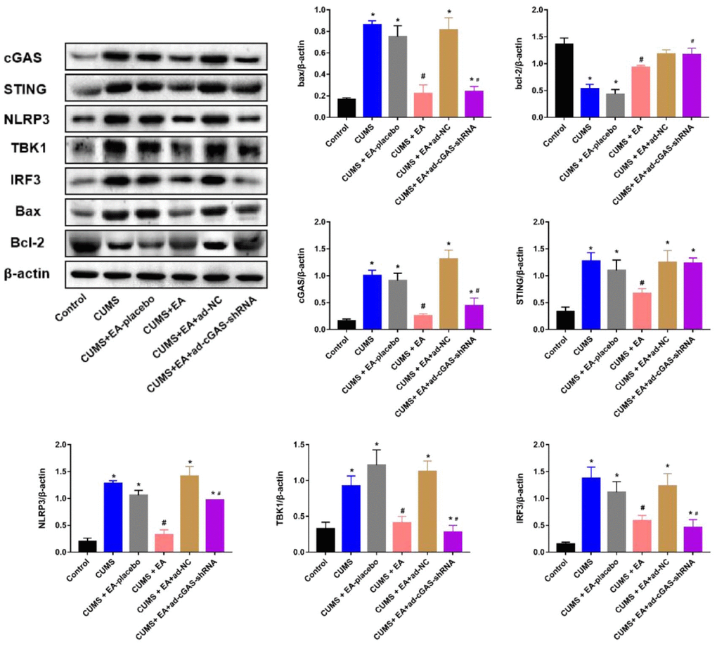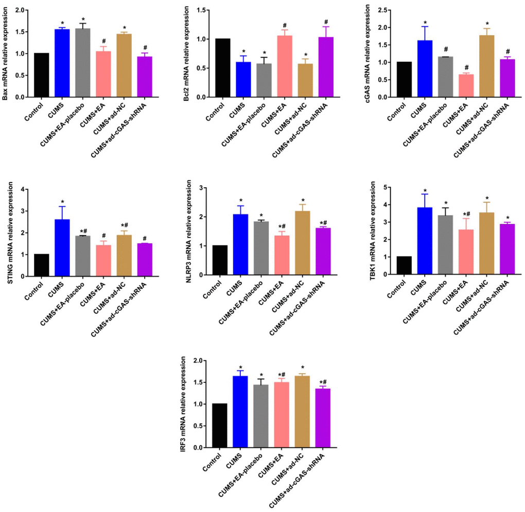 36 C57BL/6 male 6-8 weeks old mice were purchased from Hunan Slaike Jingda Laboratory Animal Co. LTD, and animals were maintained at a temperature of 18° C-26° C and humidity of 30%-70%. They were divided into 6 groups: Control, CUMS, CUMS+EA-placebo, CUMS+EA, CUMS+ad-NC, CUMS+ad-cGAS-shRNA. A mouse model of depression was established by alternate stimulation of mice once a day in various unpredictable random ways for 28 days. Stress sources included fasting for 48h, water restriction for 24h, tail clipping for 60s, heat stimulation at 45° C for 5min, tail suspension for 5min, day and night reversal, and cold stimulation at 4° C for 5min. On average, each stimulation was performed 4 times. Animals were raised in single cages. The EA treatment was performed according to the method described by Lee et al. [7]. The specific operation was to fix the mouse in a cotton mouse sleeve that could extend its limbs and keep still for 5 min, allowing the mouse to adapt before performing EA. The EA was conducted on the 14th day of modeling, using a disposable sterile stainless steel acupuncture needle (diameter 0.18 mm; length 8 mm), acupoints were KI10·LR8·LU8·LR4, needle depth was 3-4 mm, needle rotated at a speed of two rotations per second for 30 s, and then immediately removed. EA treatment was conducted every day for 2 weeks. In the CUMS+EA-placebo group, acupoints were LU8·LR4·HT8·LR2, with the same acupoint selection and treatment time as the EA treatment groups. Adenovirus intervention was performed on the 21st day of mouse modeling by injecting adenovirus containing shRNA against cGAS or shRNA-NC into the lateral ventricle. The large-scale packaging, purification, and titer determination of Adv-cGAS-shRNA required for this study were completed by Jiangxi Zhonghong Boyuan Biotechnology Co. Ltd (China). The enhanced green fluorescent protein (Adv-EGFP) packaged with adenovirus vector was used as a blank control virus, and the determined virus titer was approximately 2.0×1011 PFU/mL.