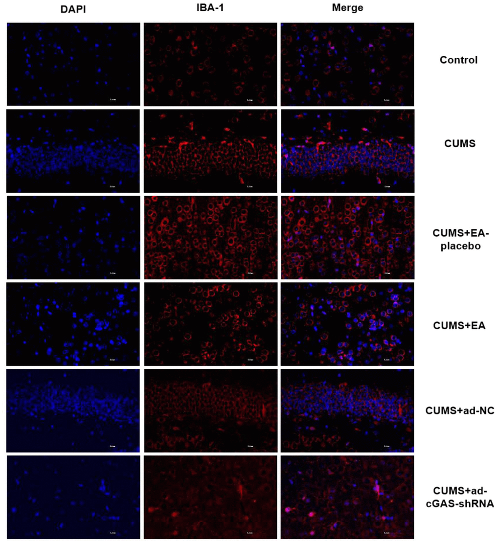 Microglia are common immunodeficient ganglion cells located in the central nervous system, which are associated with the progression of various neurological diseases. In the present study, the expression of IBA-1 in the hippocampus was detected by immunofluorescence to determine the activation of microglia. As shown in Figure 5, compared to control, the expression level of IBA-1 in the hippocampus of CUMS group was significantly upregulated, which was dramatically declined in the CUMS+EA and CUMS+ ad-cGAS-shRNA groups (*p<0.05 vs control, #p<0.05 vs CUMS). These results showed that CUMS stimulation activated microglia in the hippocampus of mice, which were dramatically repressed by EA and cGAS interference, suggesting that the therapeutic effect of EA and cGAS interference might be associated with the inhibition of microglia activation.