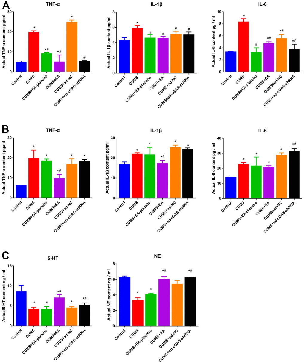 Inflammatory factors, 5-HT, and NE are closely related to the development of depression. In the present study, the concentration of inflammatory factors (TNF-α, IL-1β and IL-6) in serum and hippocampal tissues of mice were detected and the contents of 5-HT and NE in hippocampal tissues were detected using ELISA. As shown in Figure 6, compared to control, the concentration of TNF-α, IL-1β, and IL-6 in serum and hippocampus was greatly promoted in the CUMS group, which was dramatically repressed in the CUMS+EA and CUMS+ ad-cGAS-shRNA groups. Furthermore, the declined concentration of 5-HT and HE in the CUMS group was significantly increased in the CUMS+EA and CUMS+ ad-cGAS-shRNA groups (*p<0.05 vs control, #p<0.05 vs CUMS). The results revealed that CUMS stimulation significantly increased the levels of inflammatory factors in serum and hippocampus of mice, and decreased the levels of monoamine in the hippocampus, which were dramatically alleviated by EA or knockdown of cGAS.