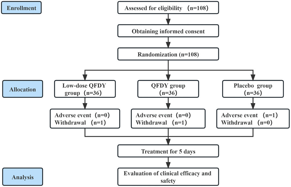 A block group randomization method was used, and the subjects were divided into the QFDY group, low-dose QFDY group and placebo control group at a ratio of 1:1:1. The SAS statistical software Proc Plan process was utilized to generate a randomized arrangement of the treatments received by each of the 108 subjects, given the number of seeds. There was competition among subcenters for enrollment in the groups. The test drug and the simulant of the test drug were produced and packaged by the sponsor, and the test drug and simulant and their packaging were indistinguishable from each other in terms of appearance, thereby meeting the requirements of blinding. The placebo was identical to its simulant except that it did not contain the active ingredient.