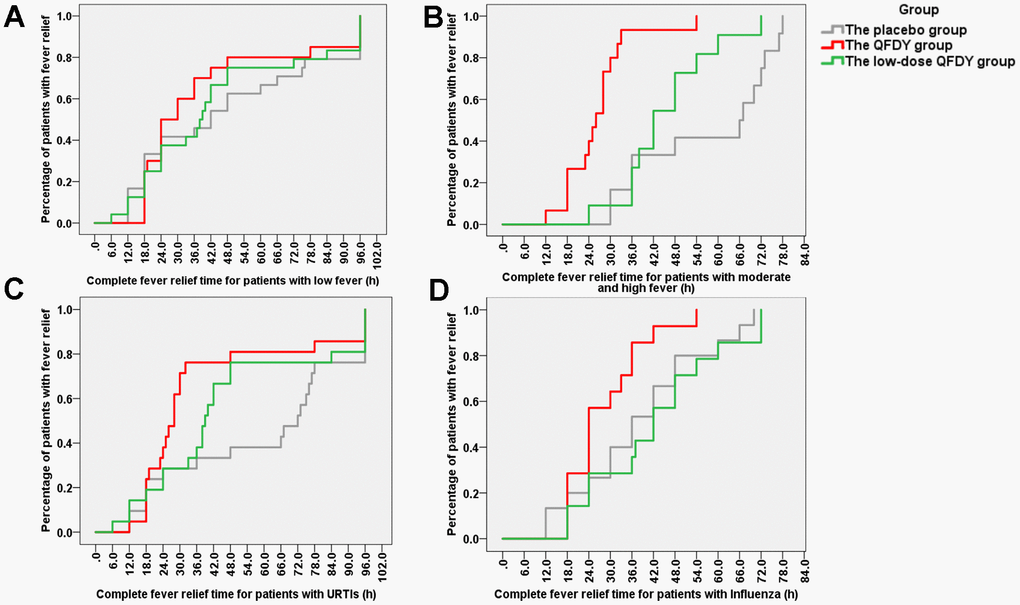 The primary outcome was the time to complete fever relief. In the FAS, the QFDY group required 26 hours (12.0, 96.0) for complete fever relief, which was significantly shorter than the time of 40 hours (6.0, 96.0) in the low-dose QFDY group and 48 hours (12.0, 96.0) in the placebo group. According to the Kaplan-Meier curve (Figure 2), both QFDY groups showed better fever relief effects than the placebo group, where the difference was statistically significant in the QFDY group compared to the placebo group (p < 0.05). In response to the different body temperatures of the patients before treatment, 106 patients were classified as having low fever (37.3-38° C), and 69 and 37 patients were classified as having moderate and high fever (38.1-41° C), respectively. According to the Kaplan-Meier curves (Figure 3A), the three groups did not have a significant efficacy in terms of the time to complete fever relief compared with patients with low fever; however, according to the Kaplan-Meier curve (Figure 3B), the two different QFDY dosage groups showed significant superiority in terms of time to complete fever relief for patients with moderate and high fever, in which the QFDY group showed significant superiority compared to the low-dose QFDY group. According to the different diseases of the patients, the statistical results showed that 43 patients were diagnosed with influenza and 63 patients were diagnosed with URTIs by the clinicians, and according to the Kaplan-Meier curve (Figure 3C), the two different QFDY dosage groups showed a better fever relief effect than the placebo group in the treatment of patients with URTIs; moreover, the QFDY group showed a better antipyretic effect than the other two groups according to the Kaplan-Meier curve (Figure 3D). The QFDY group showed a better antipyretic effect than the other two groups in the treatment of patients with influenza; however, the low-dose QFDY group showed no significant efficacy compared with the placebo group.