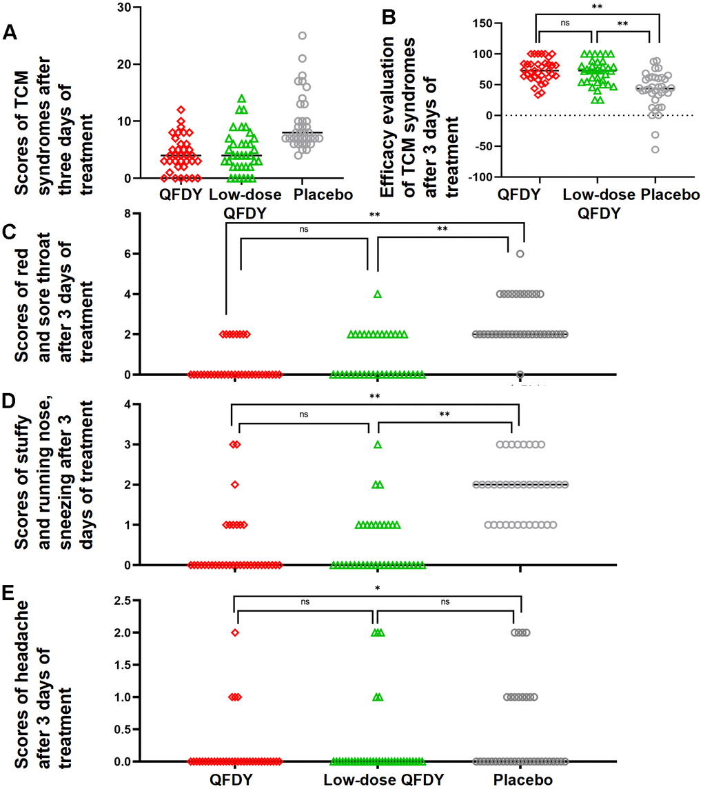 Scores of TCM symptoms: In the FAS, after the full 3 days of treatment, the efficacy of the low-dose QFDY group and the QFDY group was comparable relative to the placebo group (p < 0.05) (Figure 4A).